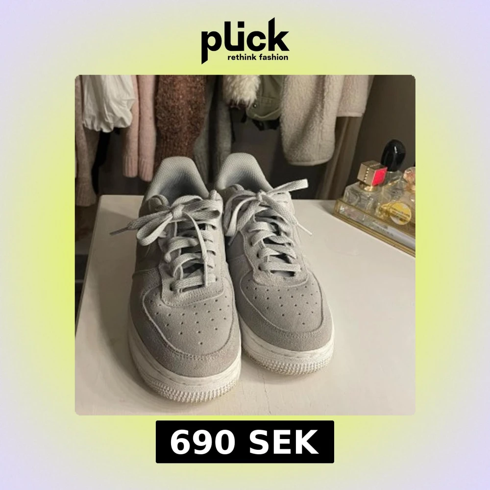 Snygga grå Nike Air Force sneakers i mocka med klassisk design och vit sula. Skorna har snörning och en subtil gulddetalj på hälen. Perfekta för en stilren look.