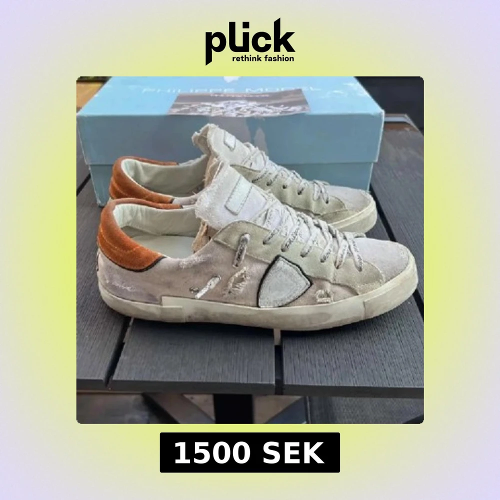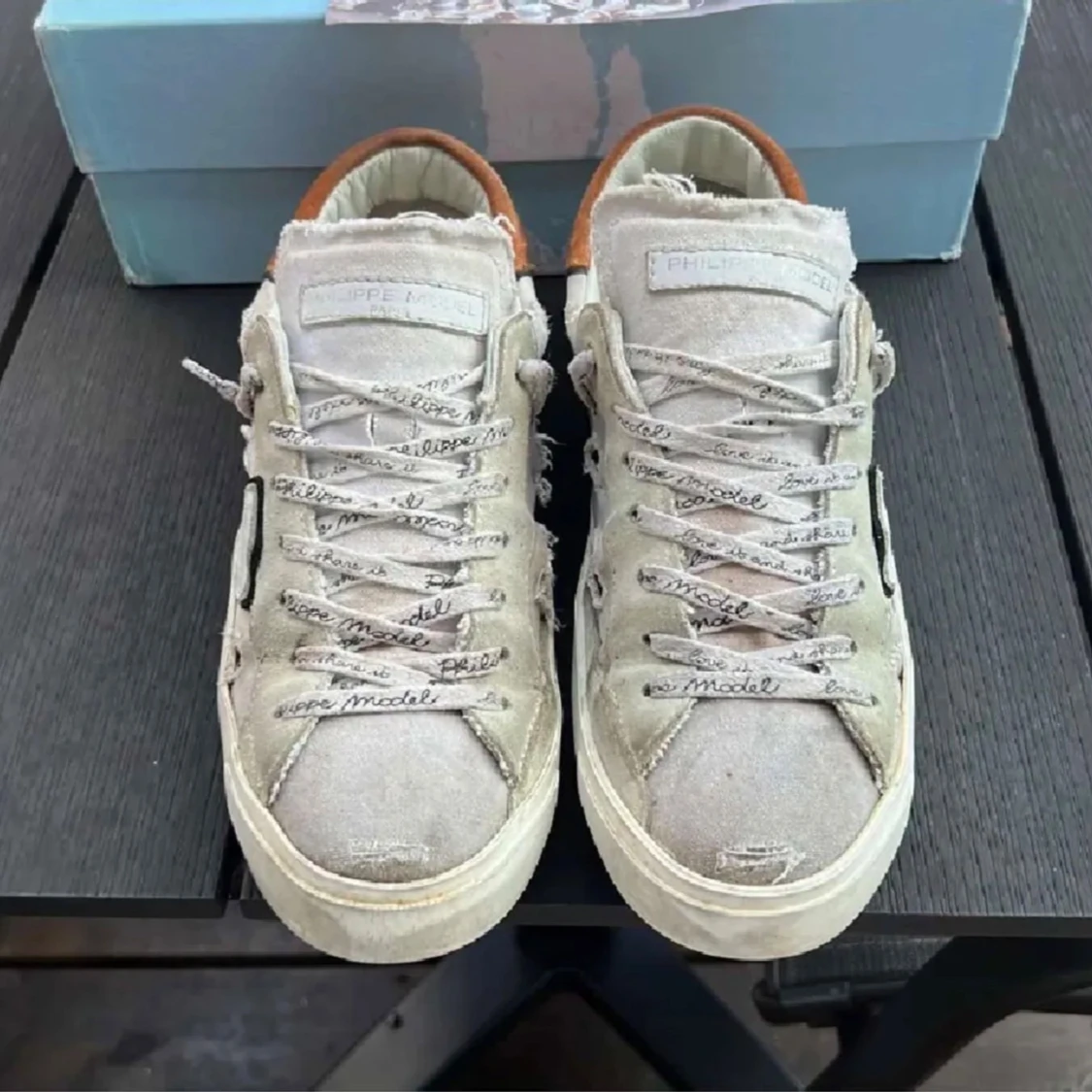 Snygga sneakers från Philippe Model i beige mocka med slitna detaljer. Beige/ljusgrönt jeans tyg och orangea detaljer i mocka. Livar upp en tråkig outfit!