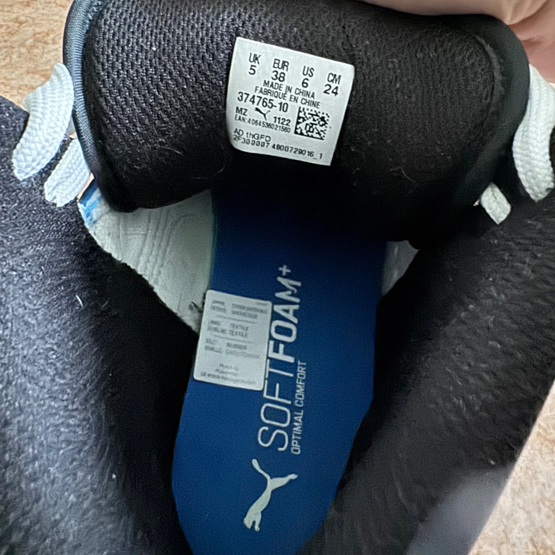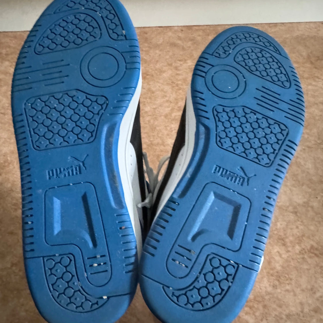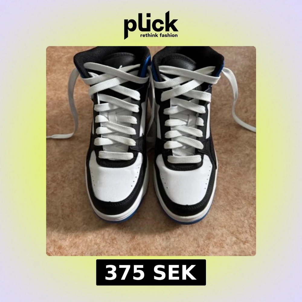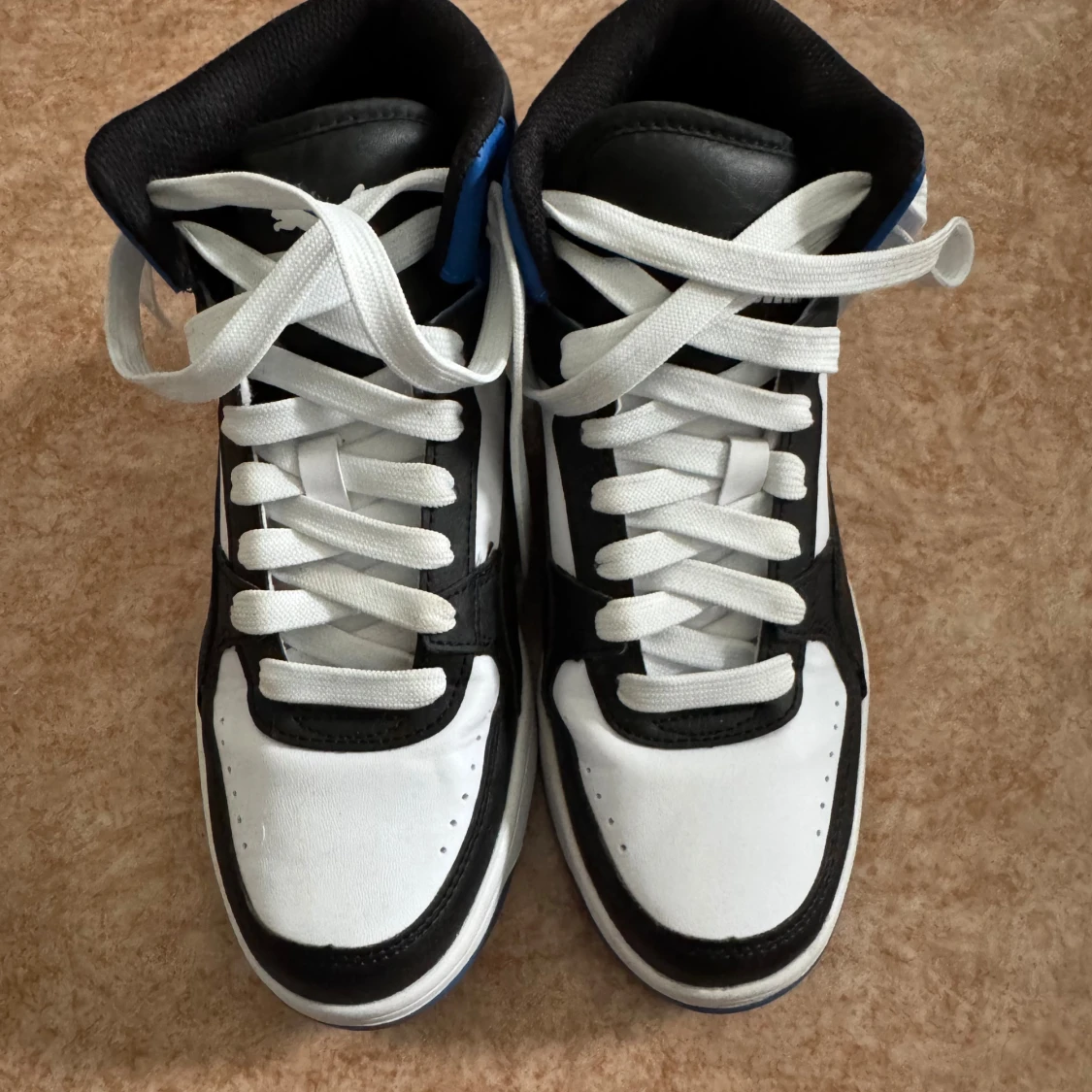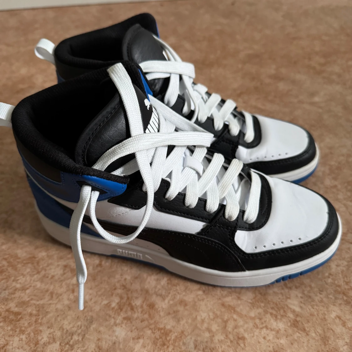 Puma sneakers i svart, vitt och blått i storlek 38. Skorna har snörning, platt blå sula och rund tå. Skorna är normala i storlek och har bara använts ett par gånger.