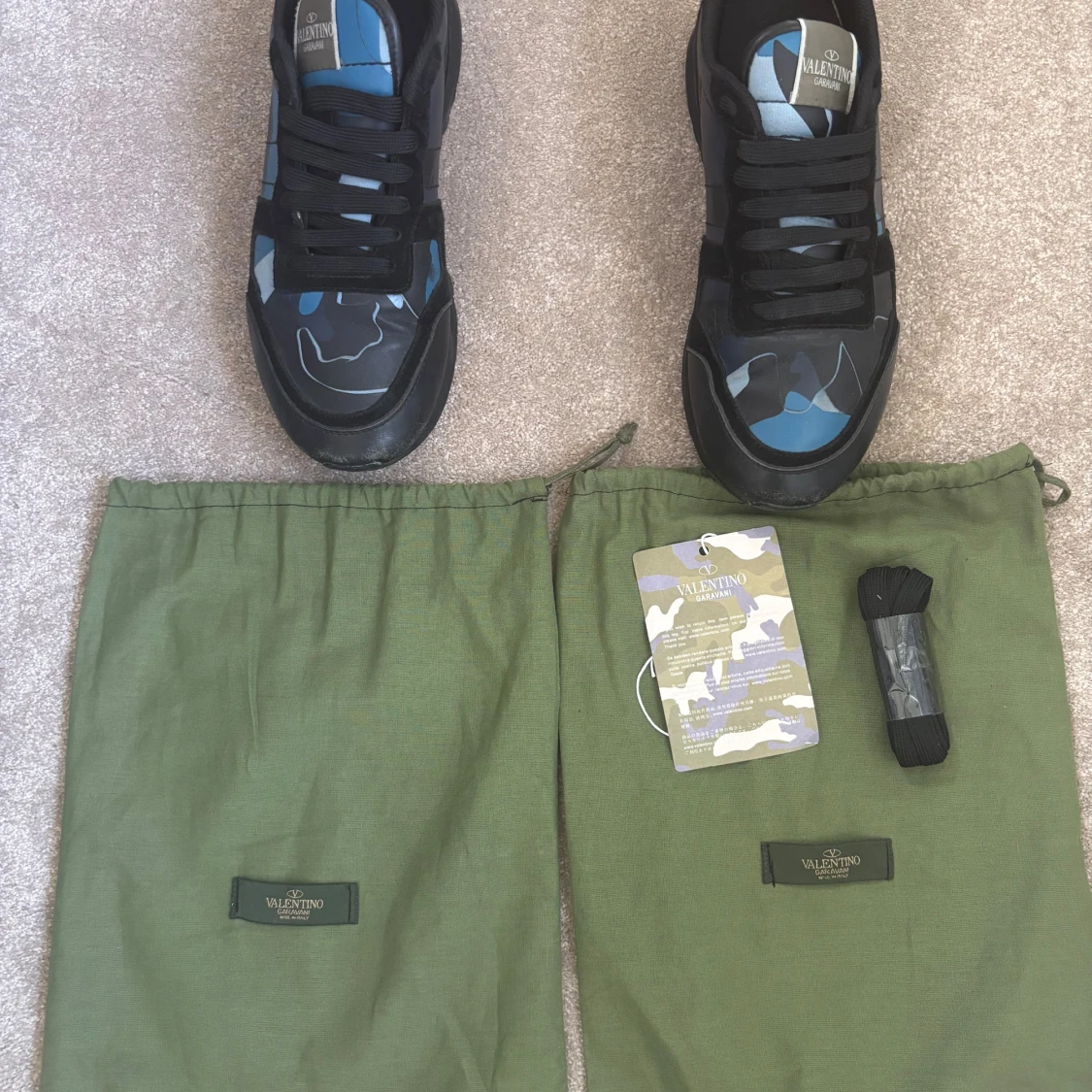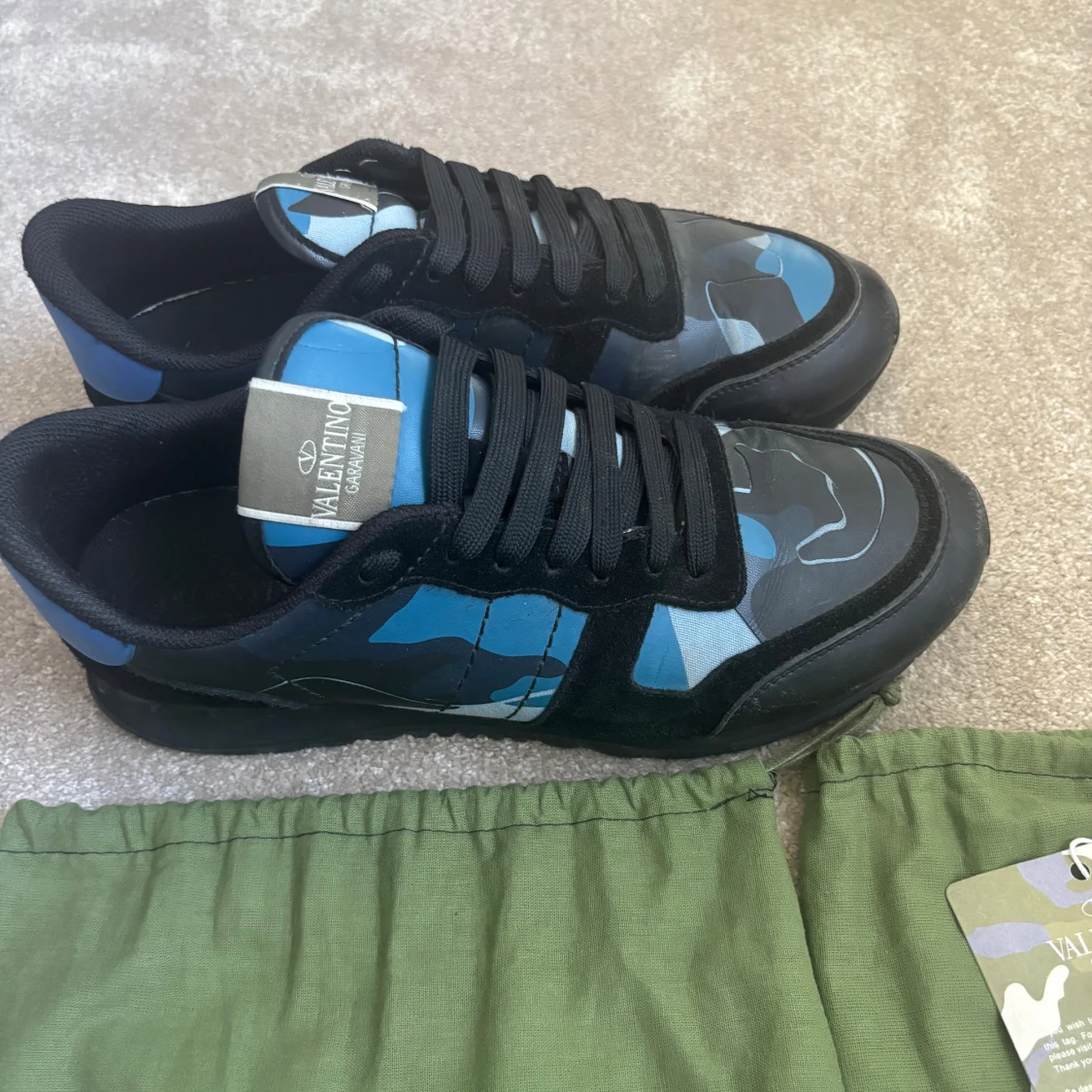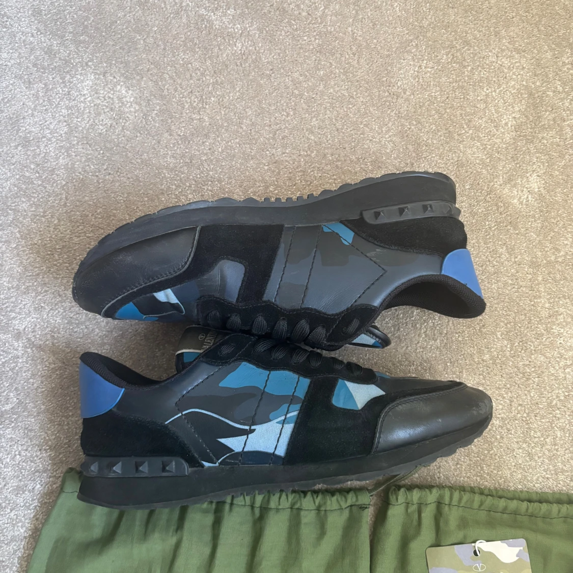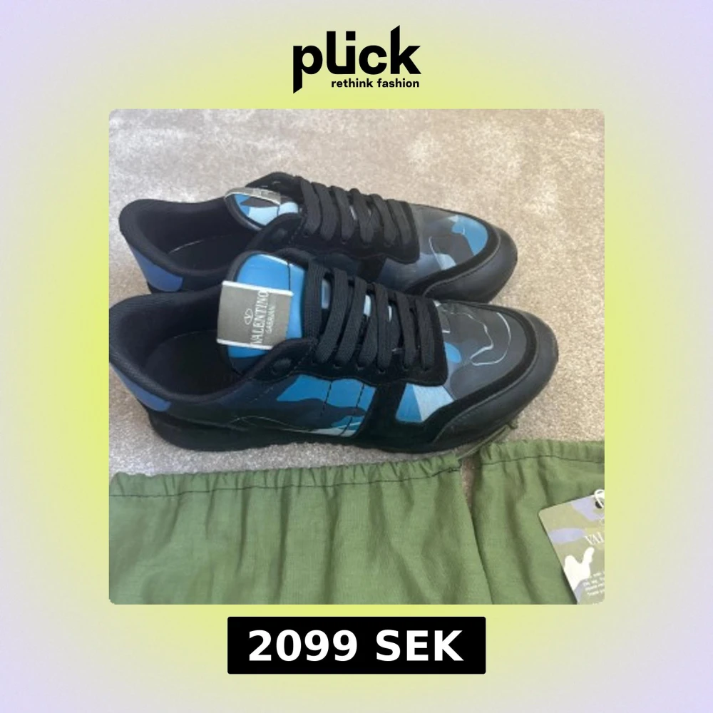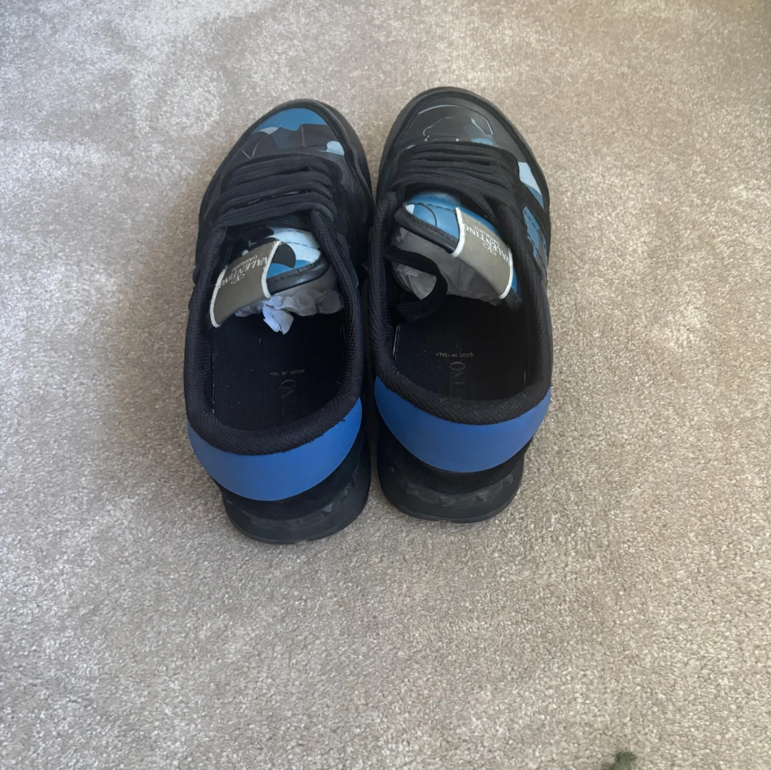 Snygga Valentino Rockrunner sneakers med svart och blått kamouflagemönster. Skorna har svarta snören, platt sula och detaljer i mocka och skinn. Ikonisk logga på tungan och coola nitar på hälen. Perfekt för dig som gillar streetstyle och exklusiva märken.