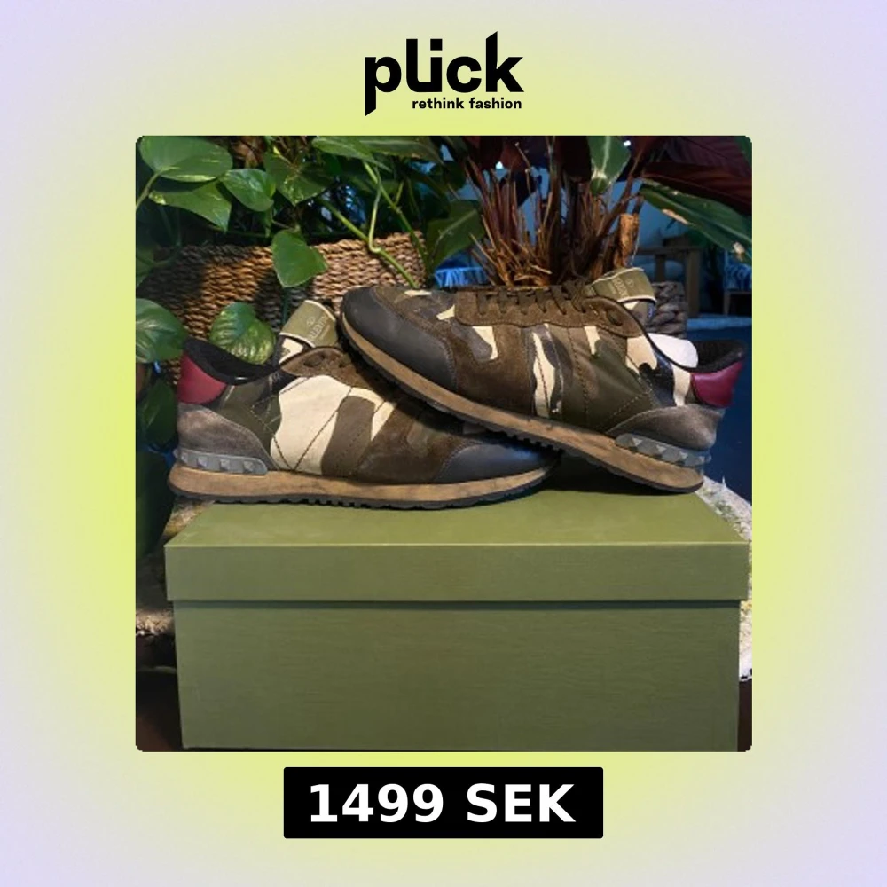 Säljer ett par Valentino Rockrunner sneakers med camouflage-mönster i grönt, beige och brunt. Skorna har detaljer i mocka och skinn samt en röd hälkappa. Klassisk rund tå och snörning framtill. Välanvända med defekter men i dugligt skick. Storlek 43 och true to size. Nypris 8000kr. Fler bilder finns i DM!