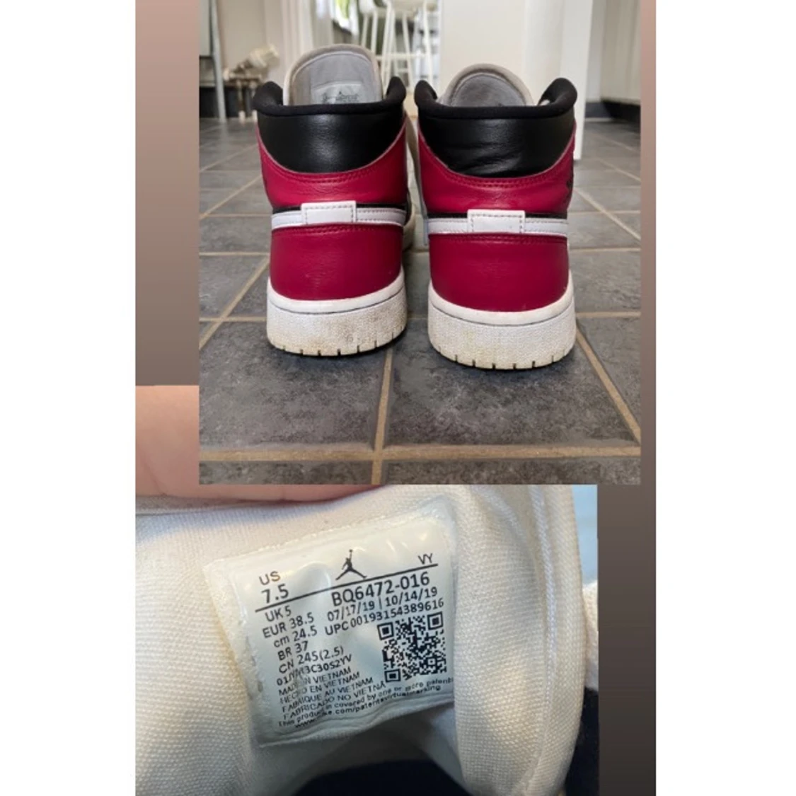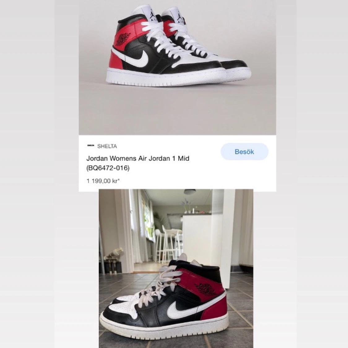Nikeskor, modellen Jordan Womans Air 1 Mid. (Vin)Röd, svart och vitfärgade. Använd skick, köpte de nya för 1199kr. Tvättar självklart upp snören osv innan jag skickar dem till köpare. Hör av dig för mer bilder, frågor / diskutering av pris.❤️