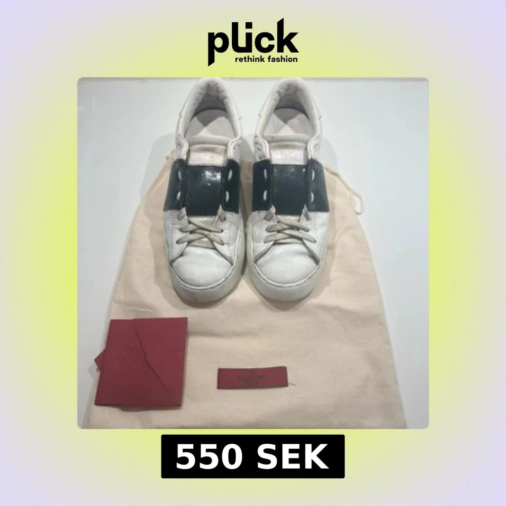 Valentino rockstud vita- svart glittriga sneakers. Snygga vita sneakers från Valentino Garavani med bred svart rem över vristen och coola nitar på hälen. Skorna är i skinn och har klassisk snörning. Kommer med originalpåse och äkthetskort. Perfekta för dig som vill ha en lyxig och trendig look. De är svartglittriga. De har blivit upprustade med läderfärg för att få sin svarta look. Man kan se detta om man tar bort snörningen men det är inte synligt från utsidan. Storlek 37
