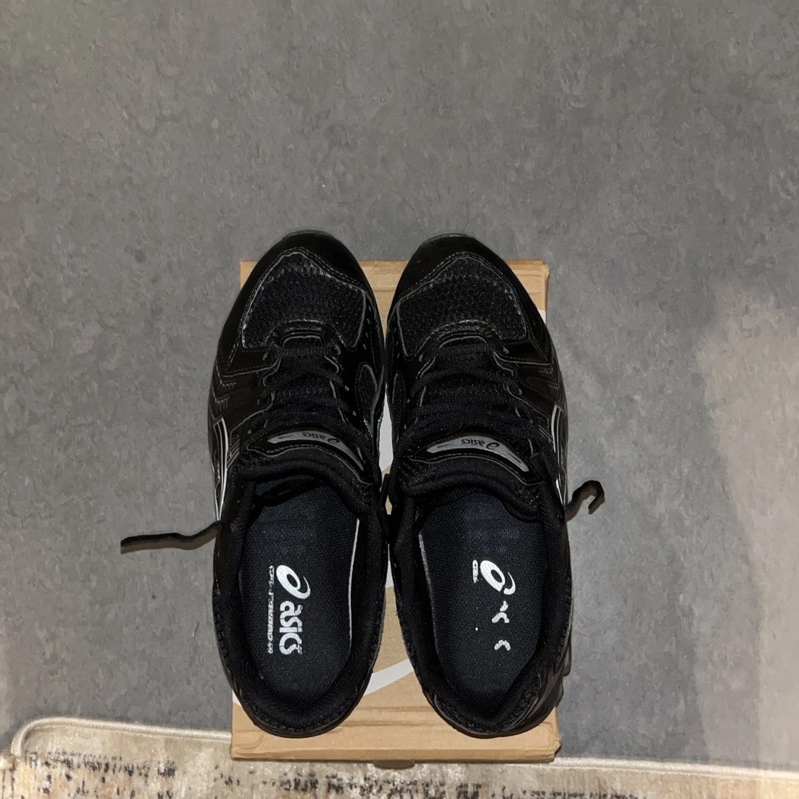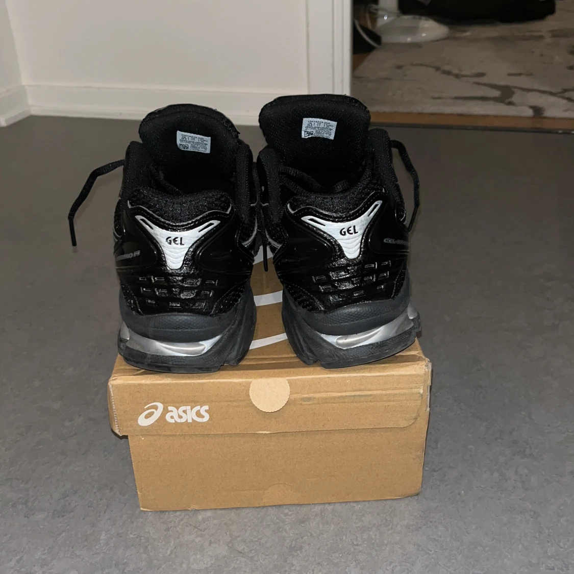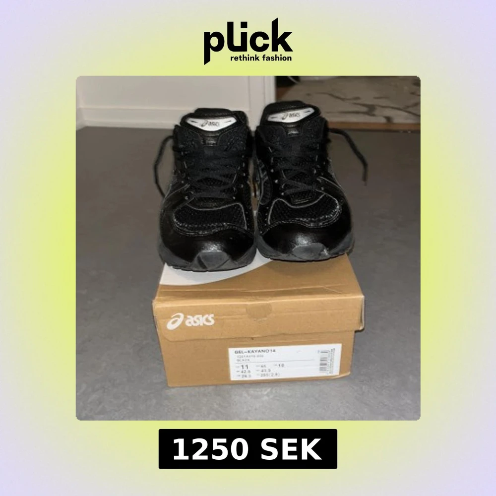 Säljer ett par svarta Asics Gel-Kayano 14 sneakers med silvriga detaljer och klassisk snörning. Skorna har en chunky sula med dämpning och meshpartier för extra ventilation. Ikonisk Asics-logga på sidan och bak, samt platt sula och rund tå. Perfekt för dig som gillar sportig stil. Har använt skorna 2 gånger så dem är nästan helt nya!