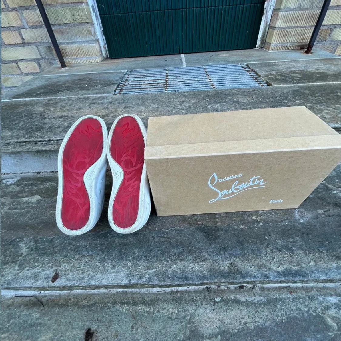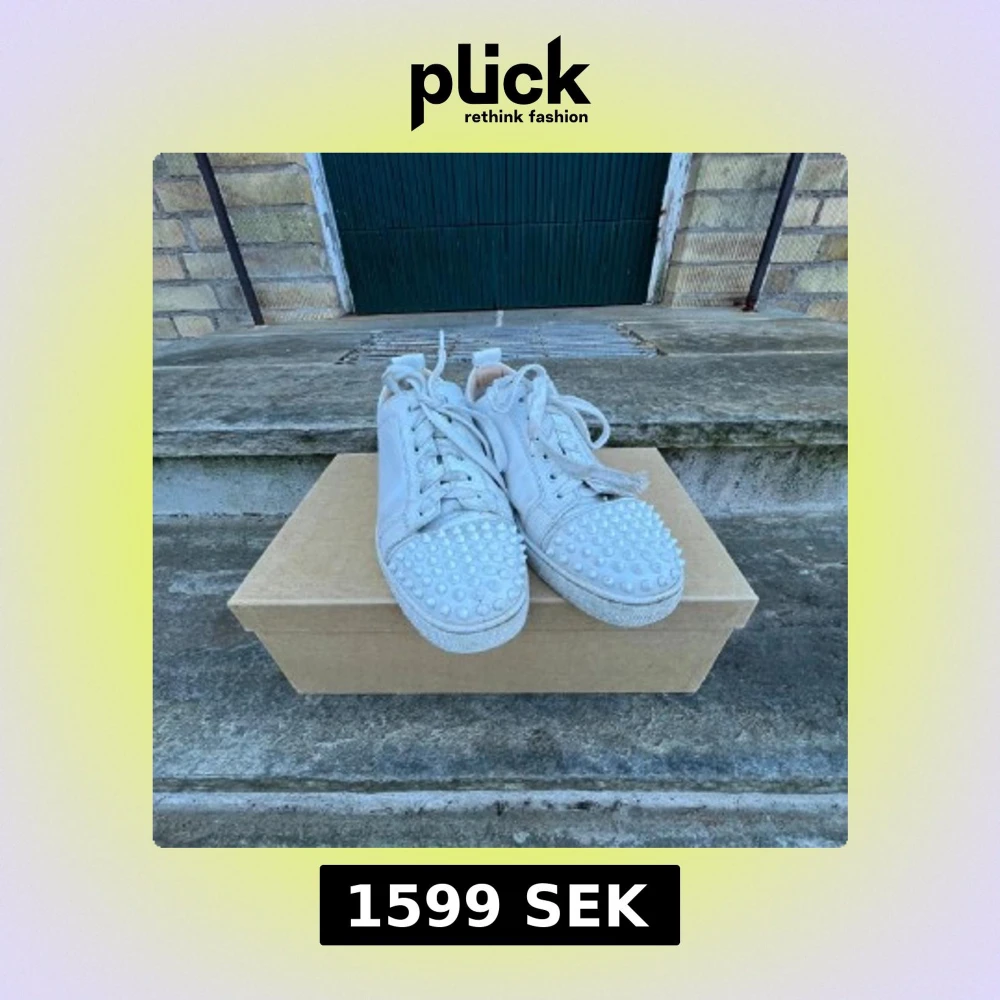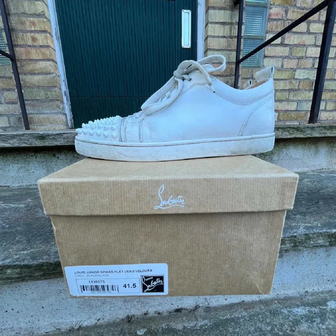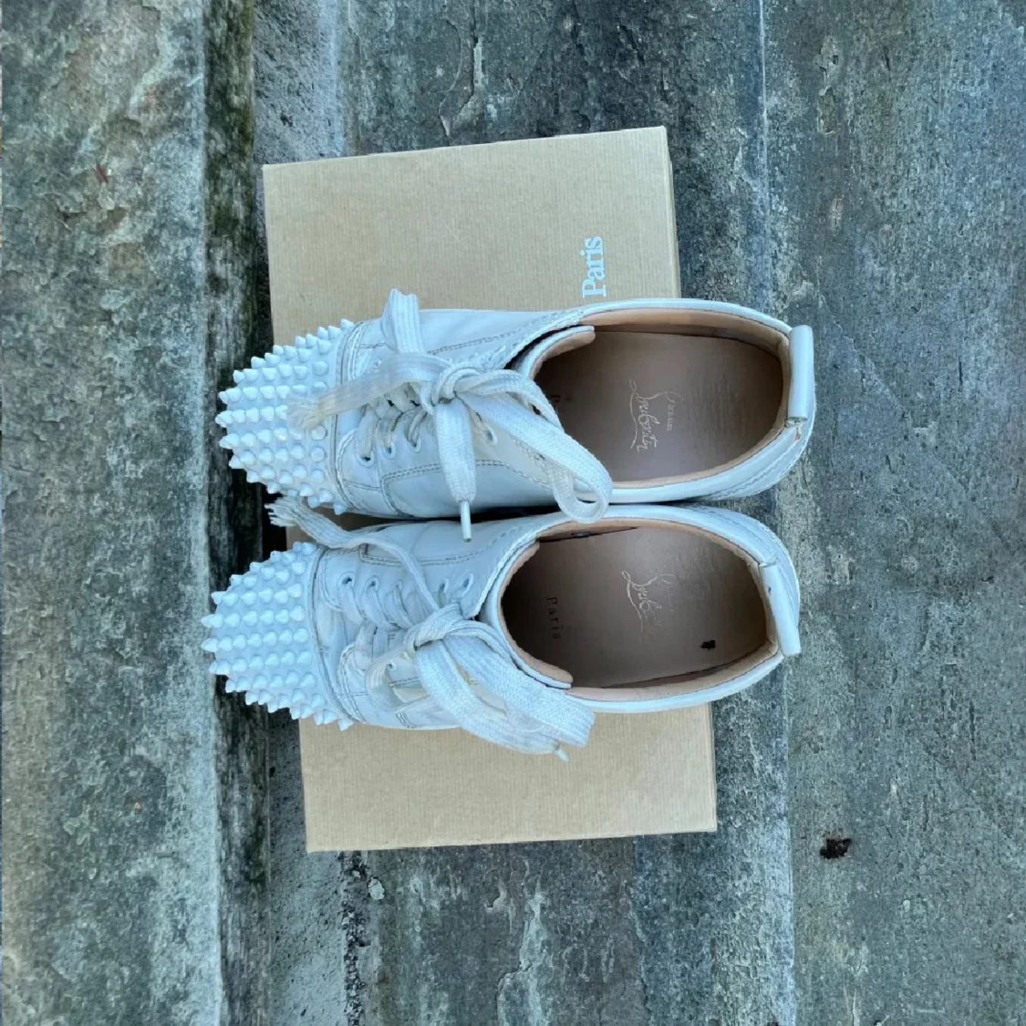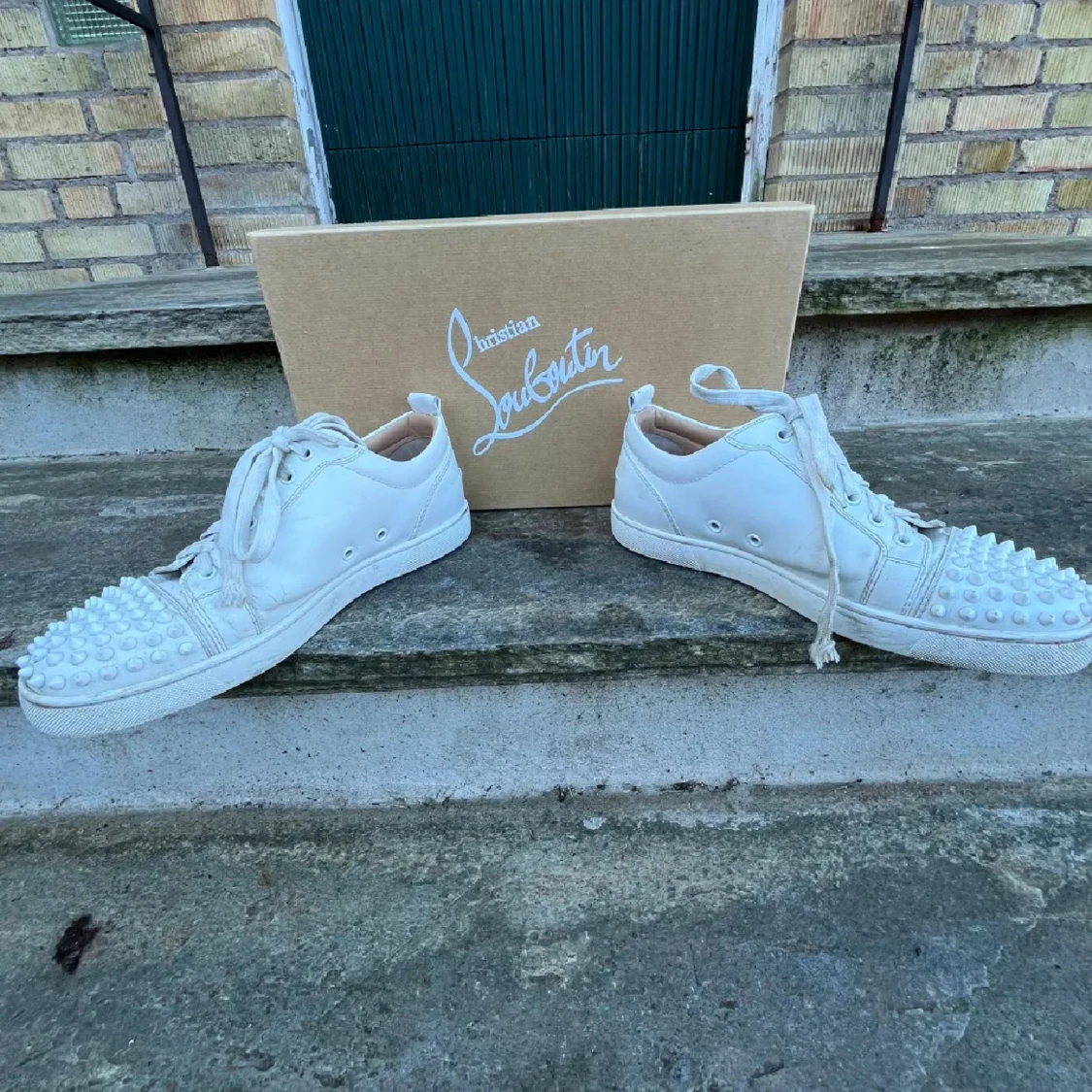 Säljer ett par vita sneakers från Christian Louboutin med coola nitar på tån och den ikoniska röda sulan. Skorna har snörning och är perfekta för att ge din stil en edgy touch. Kommer med originalkartong.