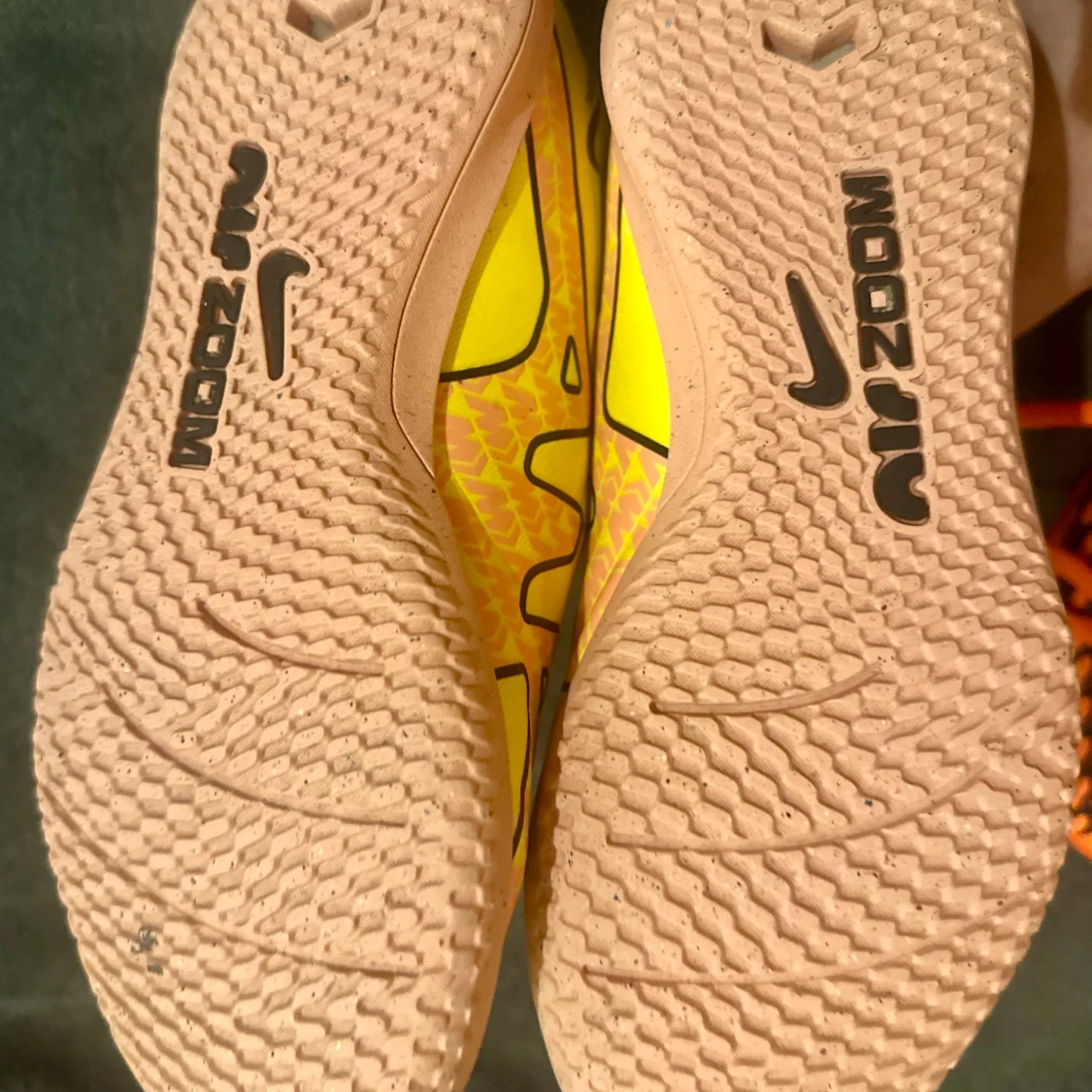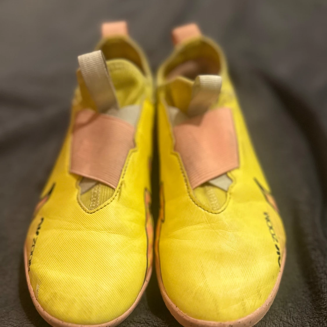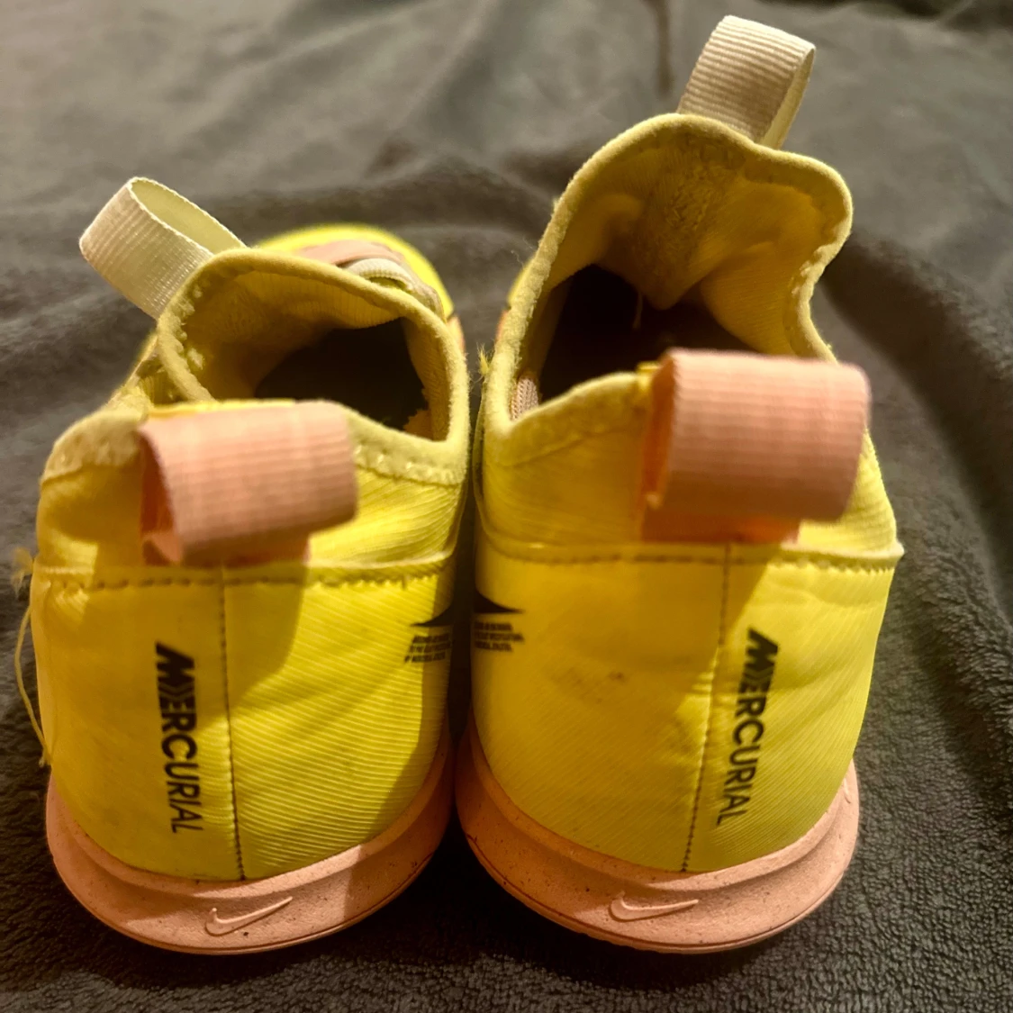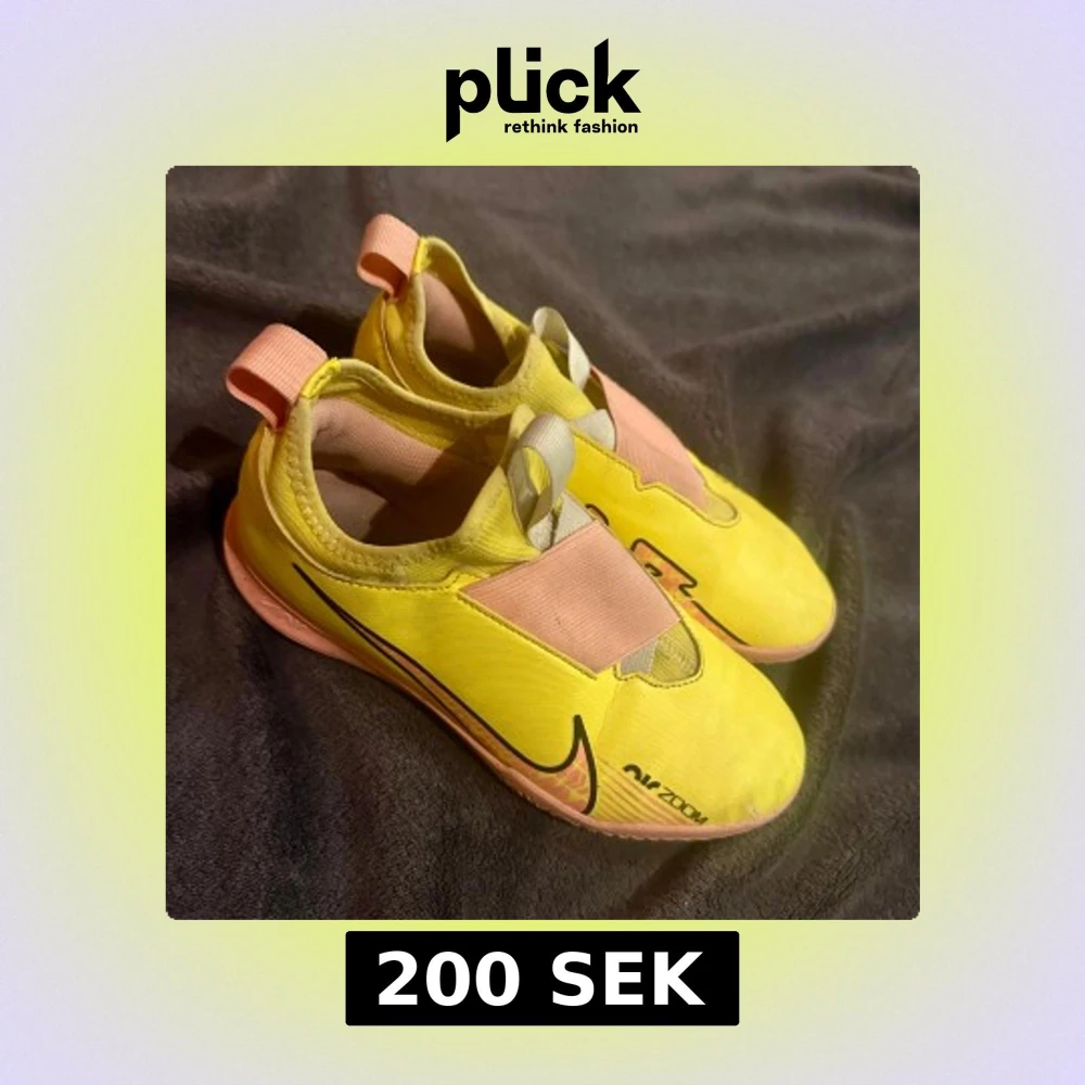 Säljer ett par gula Nike Mercurial fotbollsskor med rosa detaljer och elastisk snörning. Skorna har en smidig design med Nike Zoom-sula för extra komfort och grepp. Perfekta för inomhusfotboll eller träning.