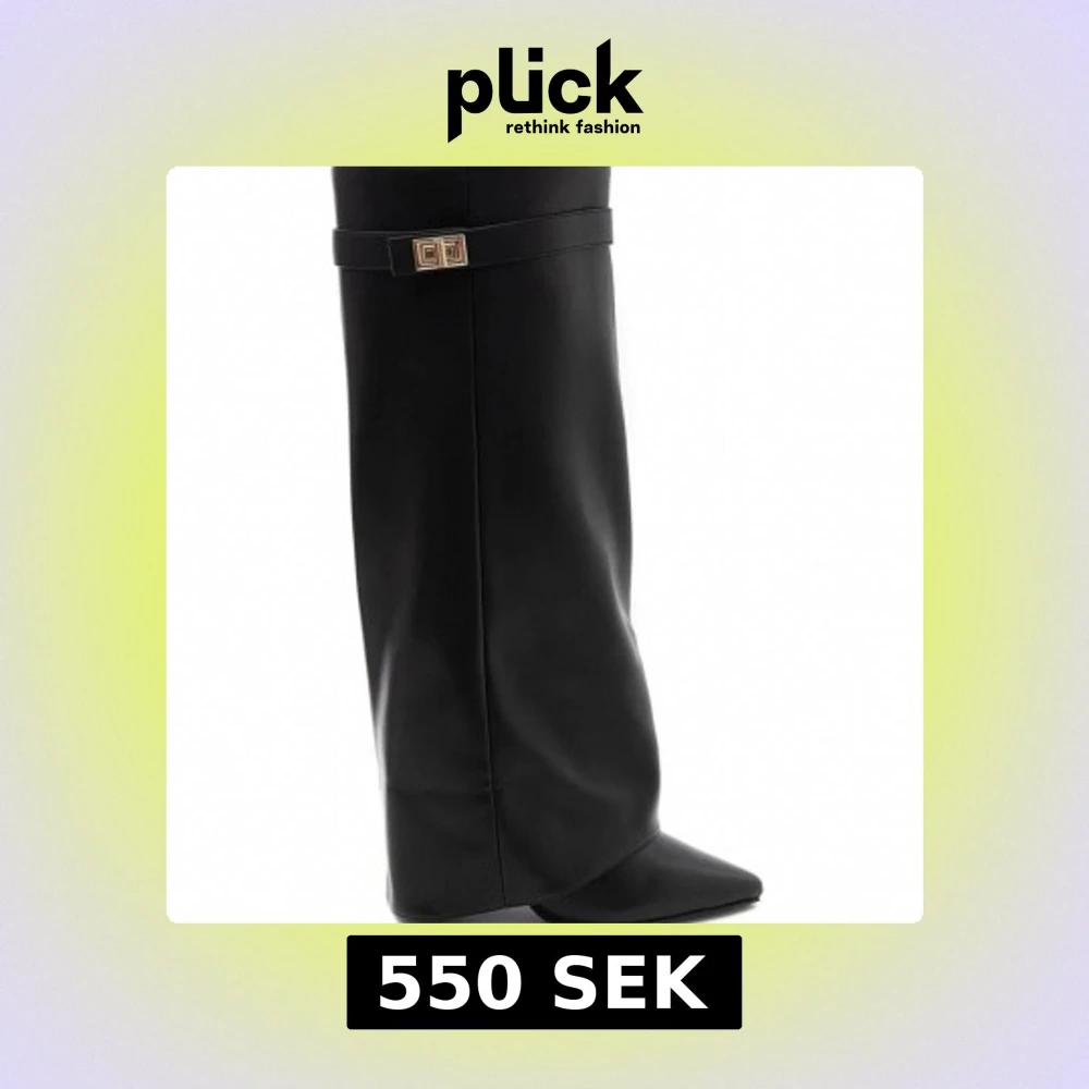 Stilrena svarta stövlar i skinn med spetsig tå och dekorativt spänne upptill. Klassisk och tidlös design med hög skaft och platt sula, perfekt för att lyfta vilken outfit som helst.