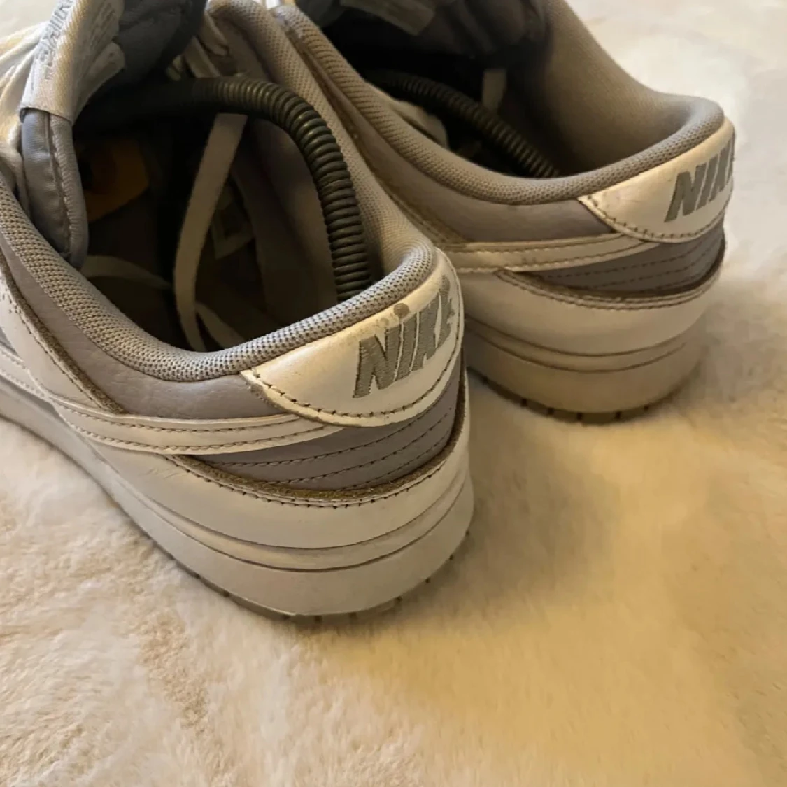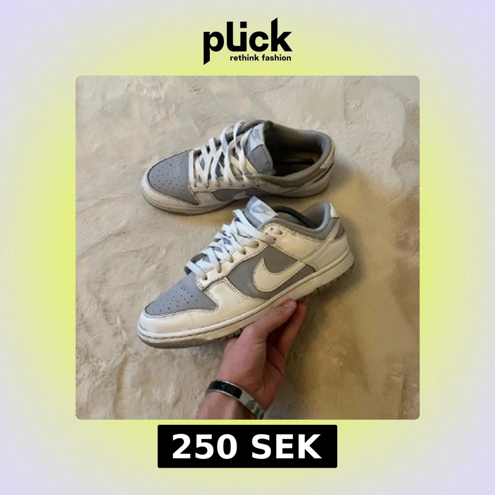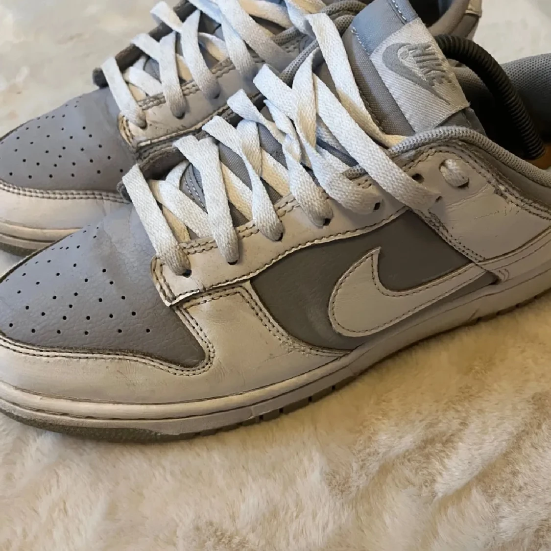 Säljer ett par Nike Dunk Low sneakers i grått och vitt. Skorna har klassisk låg siluett, vit swoosh och snörning. Perfekta för dig som gillar stilrena och tidlösa sneakers med streetkänsla.