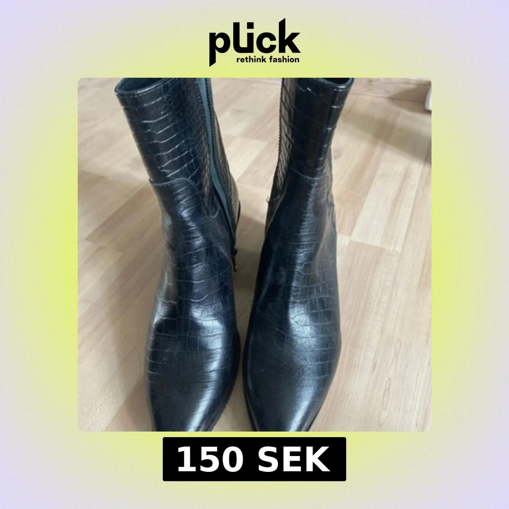 Snygga svarta boots med spetsig tå och klack. Skorna har ett krokopräglat mönster och dragkedja på sidan. Tillverkade i skinnimitation som ger en lyxig känsla.