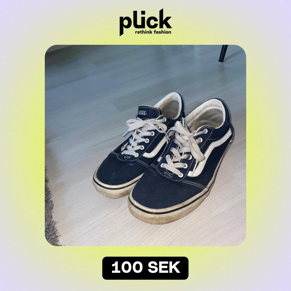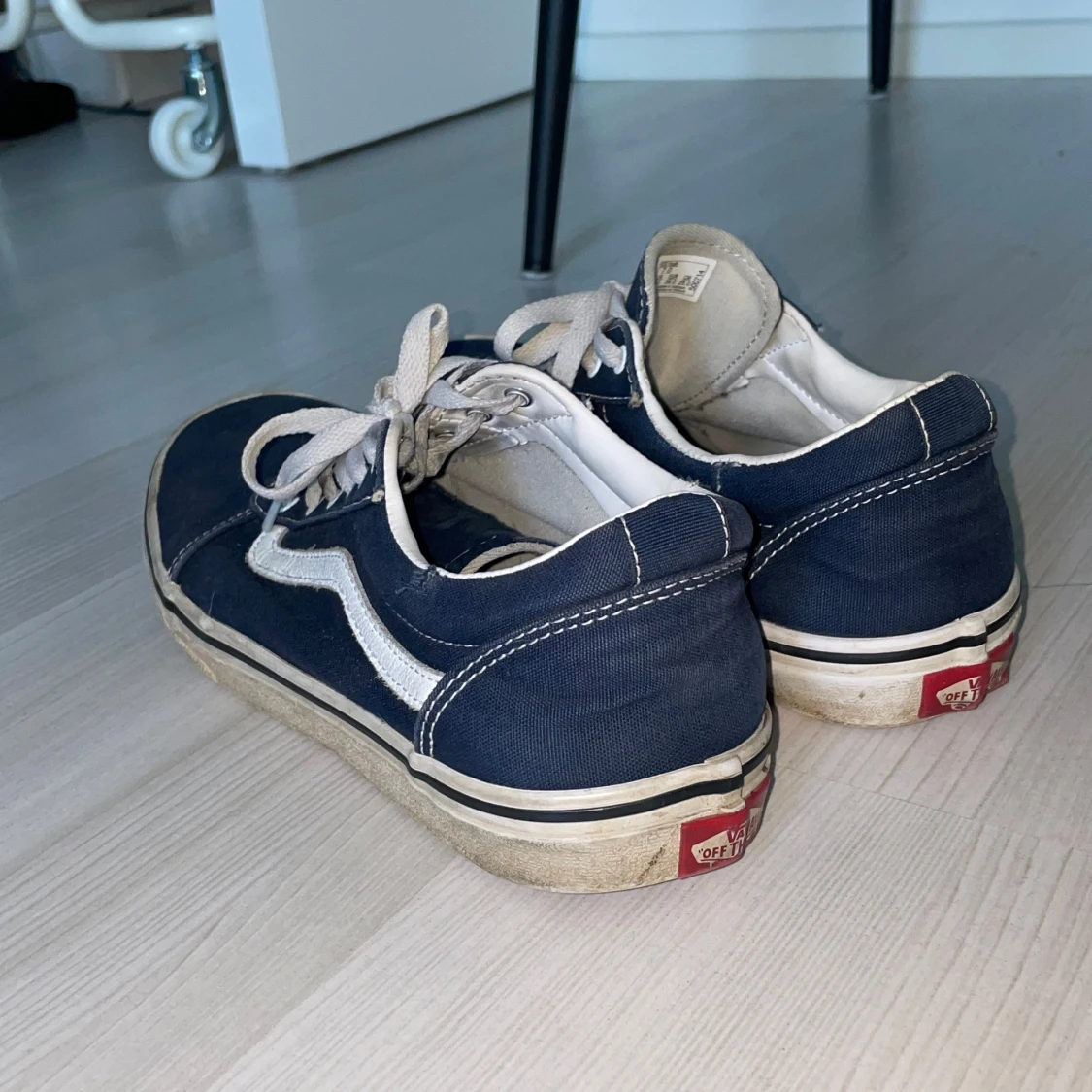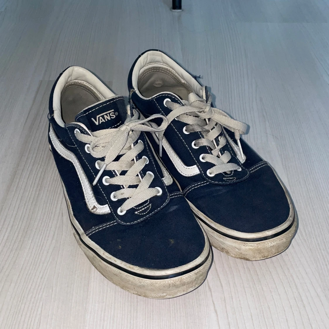 Säljer ett par klassiska marinblåa Vans sneakers med vit sula och snörning. Skorna har den ikoniska vita sidoremsan och är i bra skick. Strl 39💙