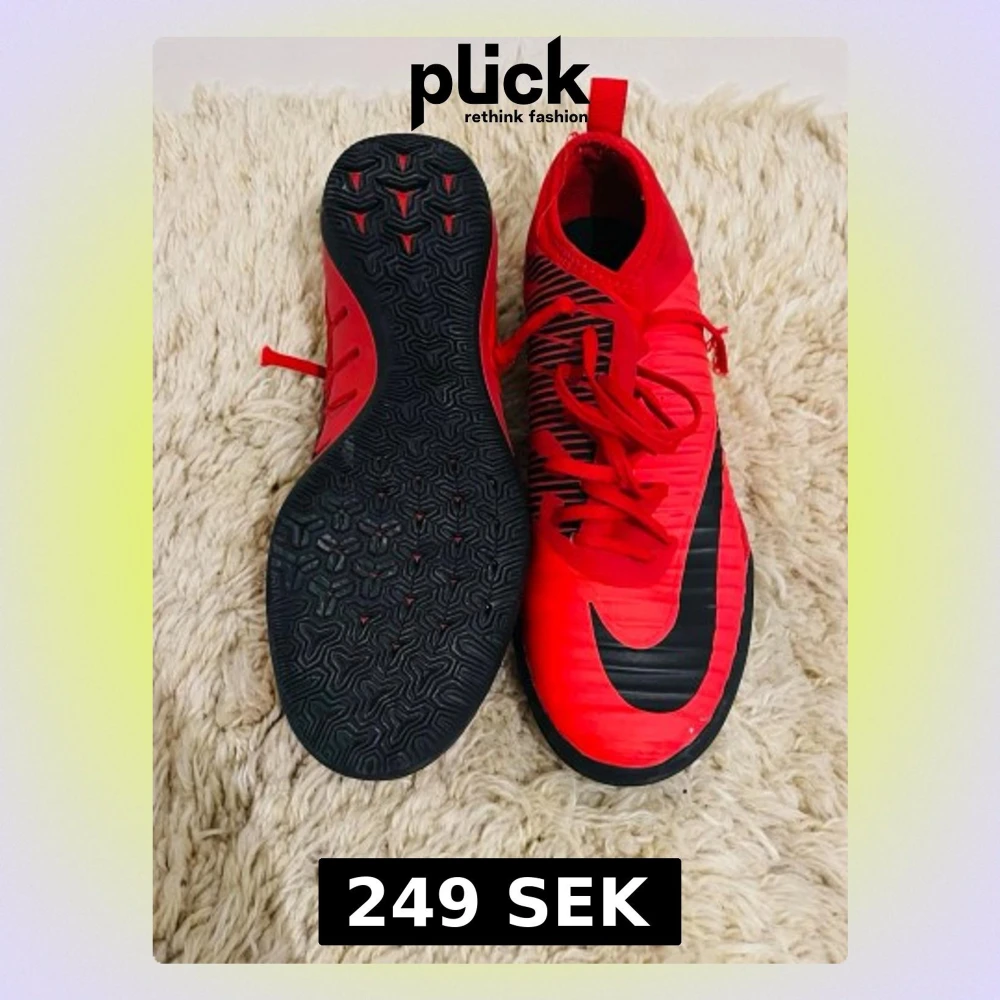 Snygga röda Nike fotbollsskor med svart sula och svarta detaljer. Skorna har snörning och ett sportigt mönster på sidan. Tillverkade i syntetmaterial för bra grepp och komfort på planen. Perfekta för dig som vill sticka ut på planen.