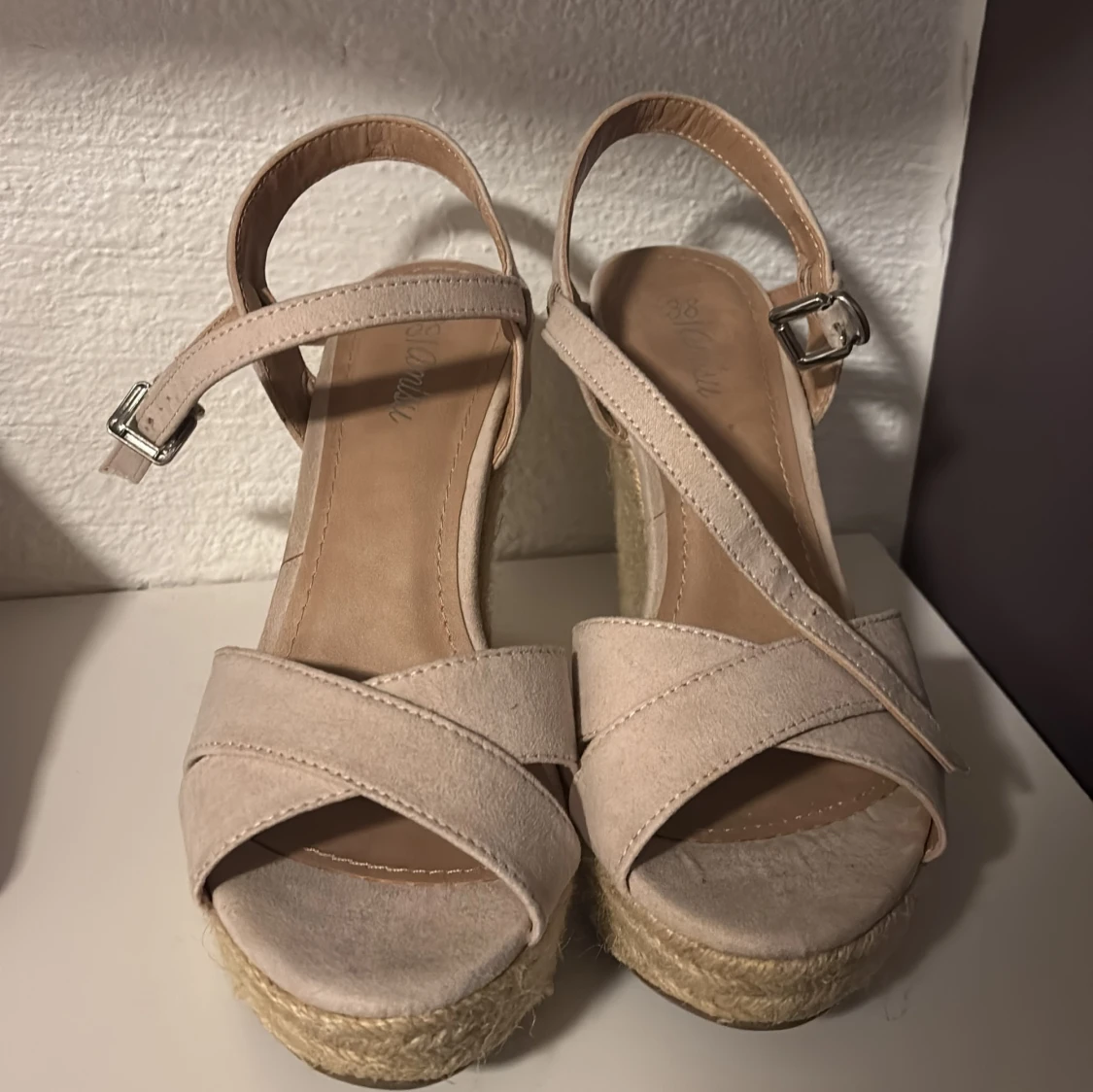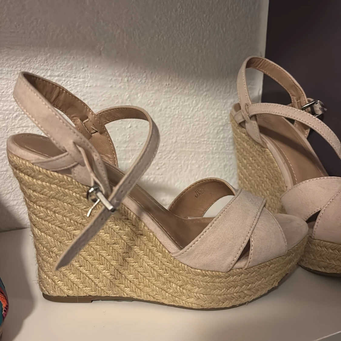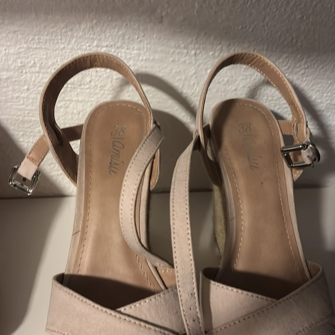 Snygga sandaler från Amisu i beige mockaimitation med höga flätade platåklackar i rep. Skorna har öppen tå, korsade remmar framtill och justerbart spänne vid ankeln. Perfekta för sommarens alla tillfällen när du vill ha lite extra höjd.