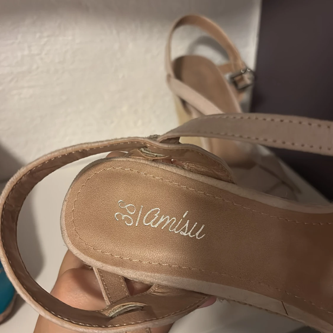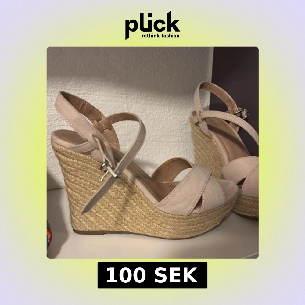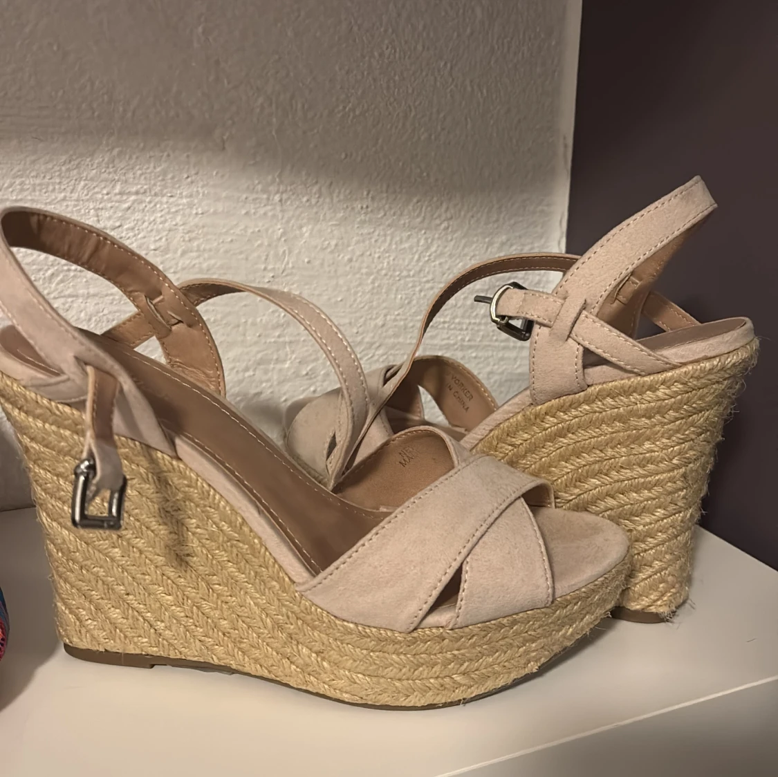 Snygga sandaler från Amisu i beige mockaimitation med höga flätade platåklackar i rep. Skorna har öppen tå, korsade remmar framtill och justerbart spänne vid ankeln. Perfekta för sommarens alla tillfällen när du vill ha lite extra höjd.