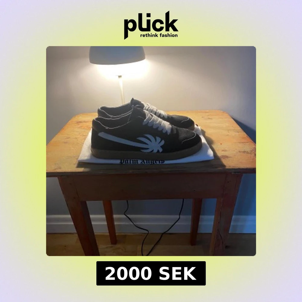 Svarta sneakers från Palm Angels med vit palm-logga på sidan och vita snören. Skorna har en brun sula och är tillverkade i mocka och skinn. Köptes på end en engelsk hemsida låda ingår. Priset är diskuter bart! Använda runt 5 gånger