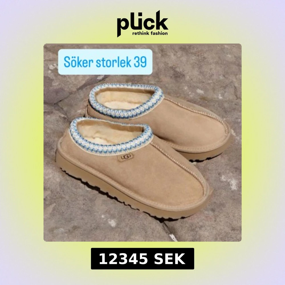Söker i storlek 39. Mysiga slip-in skor från UGG i beige mocka med fluffigt ullfoder. Skorna har en dekorativ kant i blått och vitt runt öppningen och en rejäl platt sula. Perfekta för kalla dagar när du vill ha det extra bekvämt.