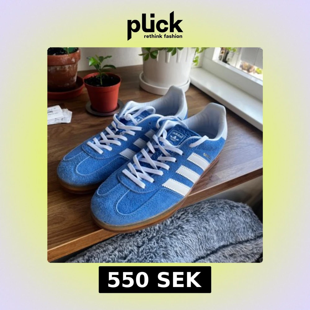 Adidas Gazelle sneakers i blå mocka med vita detaljer och klassiska tre ränder på sidorna. Skorna har vit hälkappa, vit snörning och gummisula med mönster. Perfekt för dig som gillar retrostil och vill sticka ut med färg. Skorna är använda lite så mockan är väldigt lite skadad.