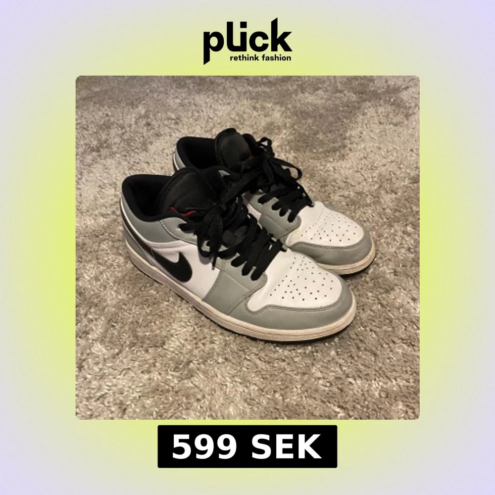 Jordan 1 low ”light somke gray”. Köpta här på Plick utan box, vet ej om äkta därav priset.