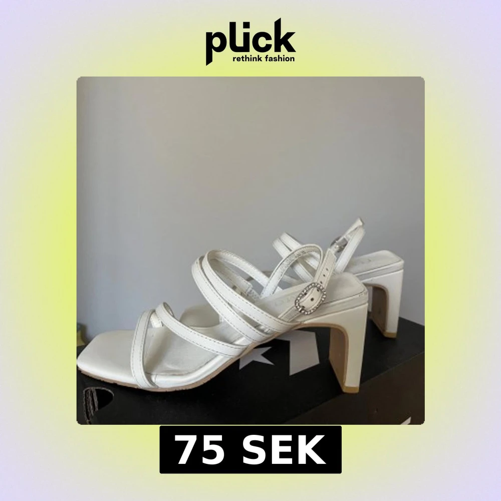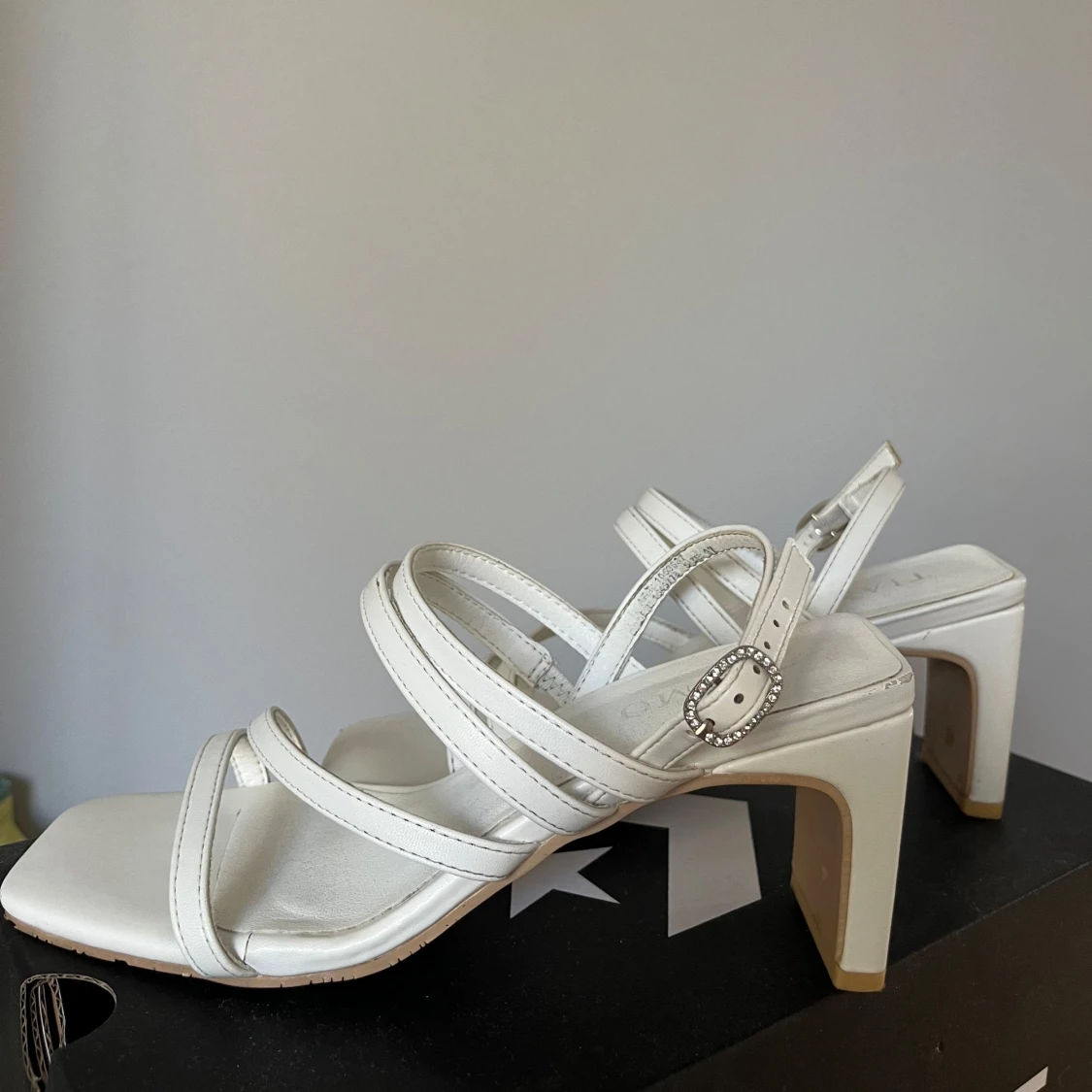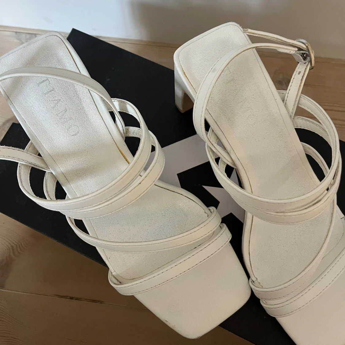 Snygga vita sandaler från Tiamo med flera smala remmar och fyrkantig tå. Skorna har en stabil blockklack på ca 7 cm och justerbart spänne med strassdetaljer. Perfekta för sommaren eller en festoutfit🩷