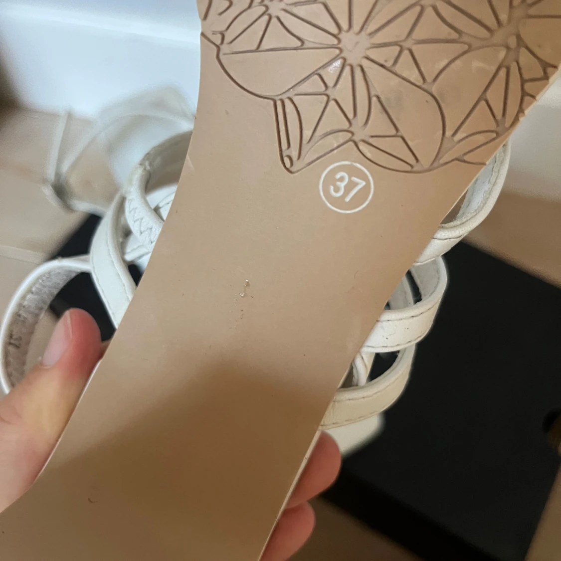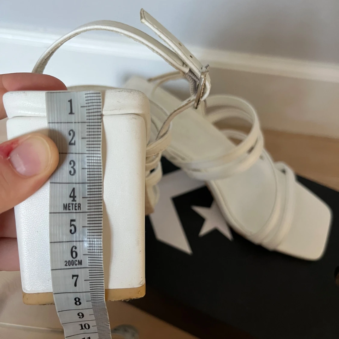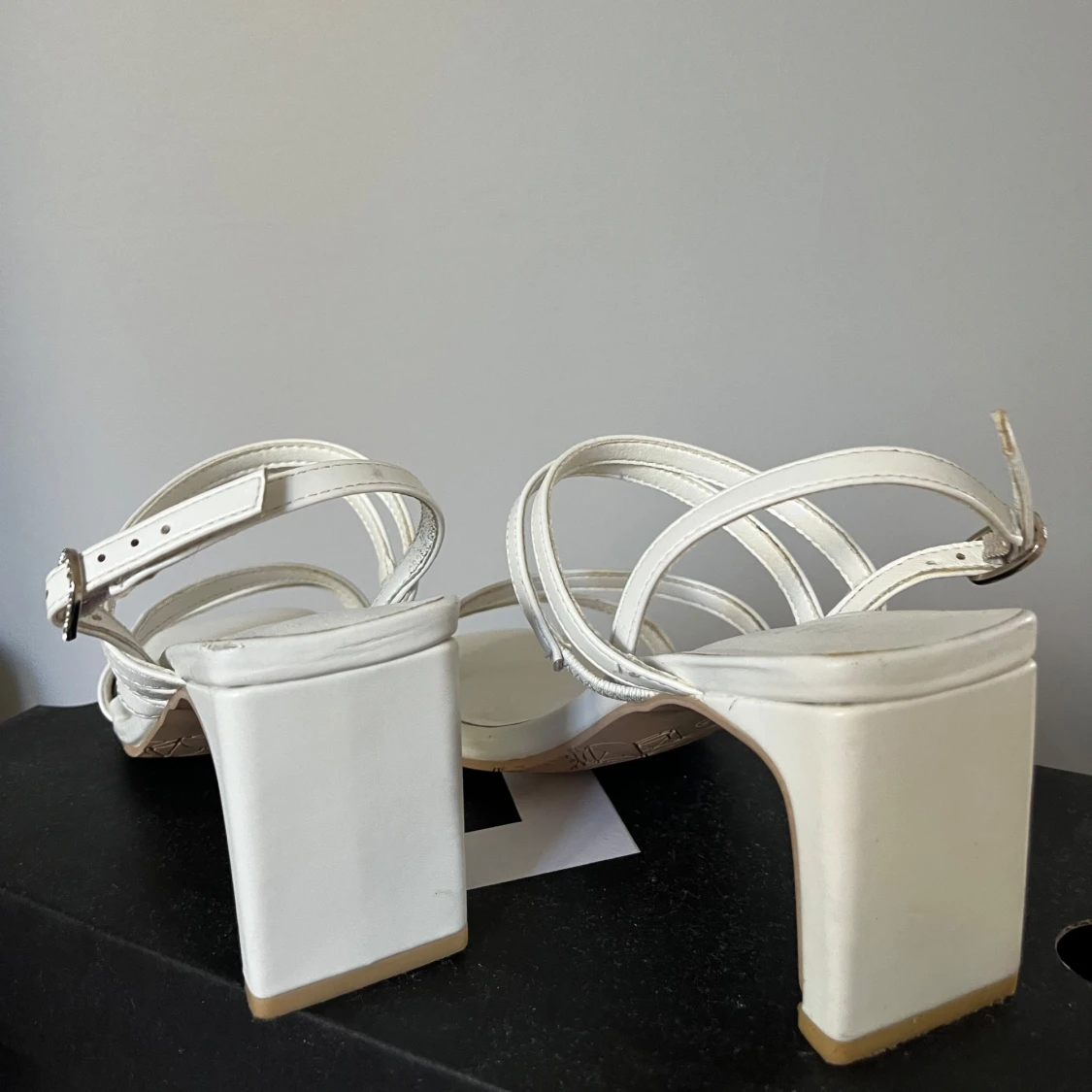 Snygga vita sandaler från Tiamo med flera smala remmar och fyrkantig tå. Skorna har en stabil blockklack på ca 7 cm och justerbart spänne med strassdetaljer. Perfekta för sommaren eller en festoutfit🩷