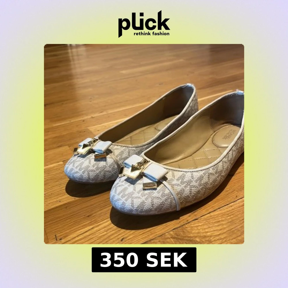 Säljer ett par vita ballerinaskor från Michael Kors med diskret MK-mönster, quiltad innersula och dekorativ rosett framtill med guldfärgade detaljer. Perfekta för en stilren och elegant look.