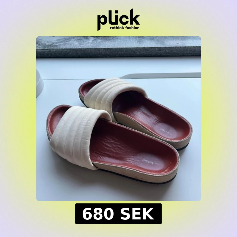 Super coola Isabel Marant tofflor/flipflops med röd sula o beige över grej (?). Står ingen storlek men skulle säga passar 36/37. De är välskötta o så fina🥰❤️. Skriv om någon fråga!