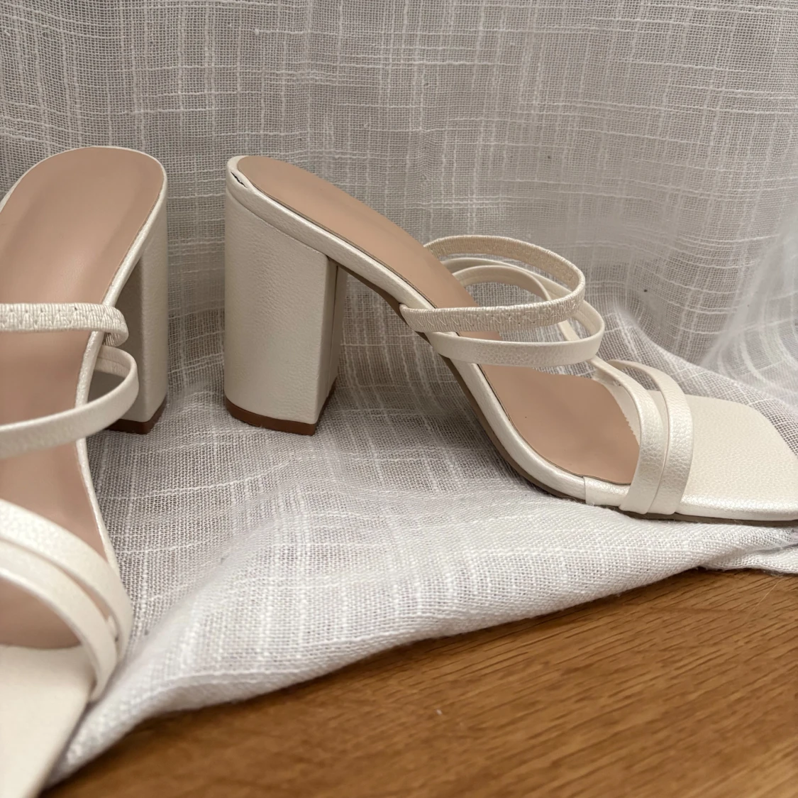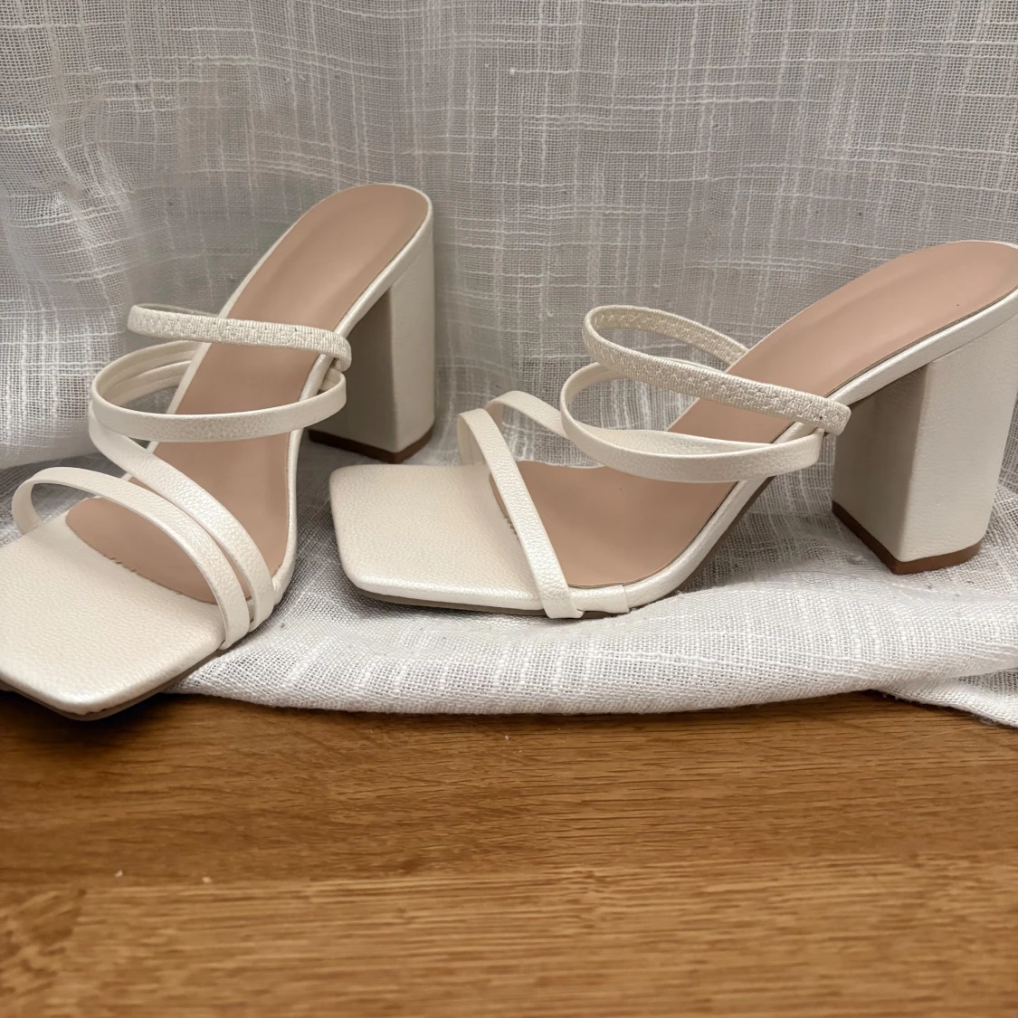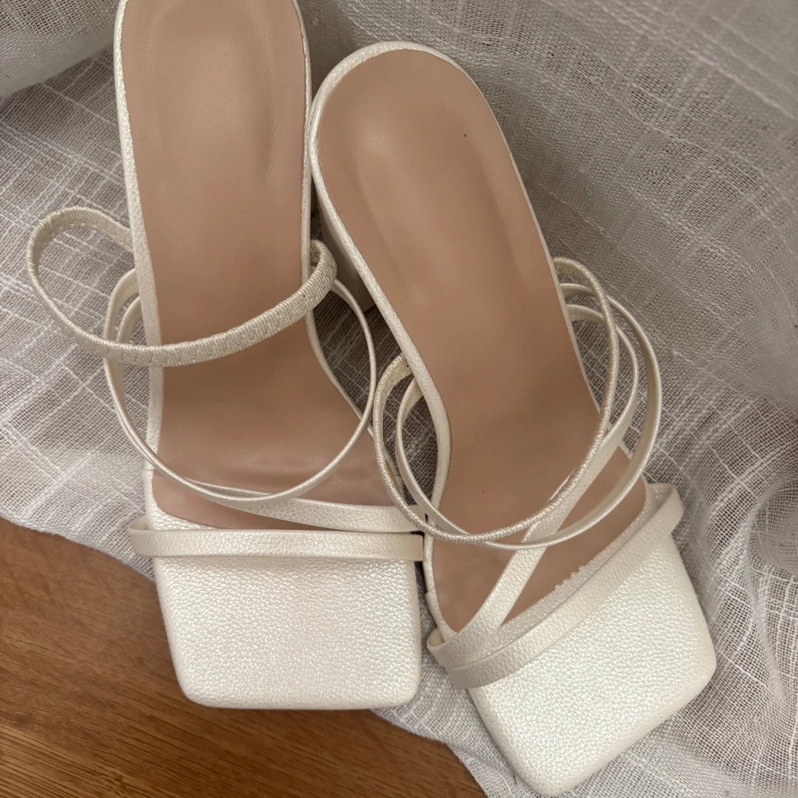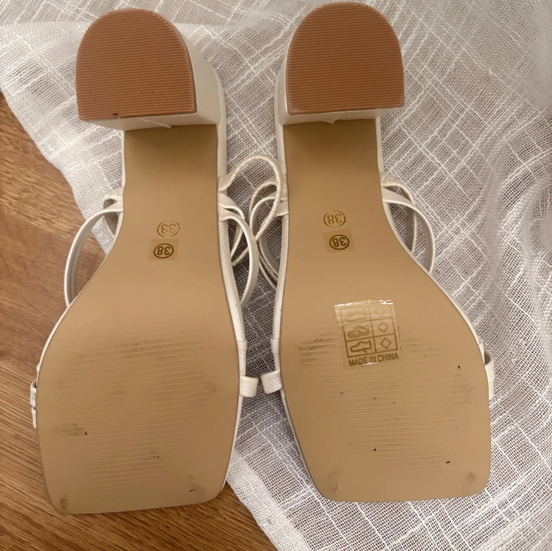Eleganta vita sandaler med fyrkantig tå och blockklack. De har tunna remmar som korsar över foten för en stilren look.