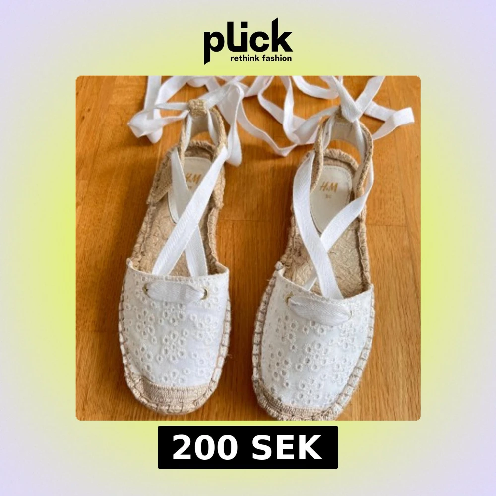 Snygga sandaler från H&M i storlek 36 med vit broderad ovandel i bomull och långa band att knyta runt ankeln. Sula i naturfärgat flätat material ger en boho-vibe. Perfekta för varma dagar och sommaroutfits!