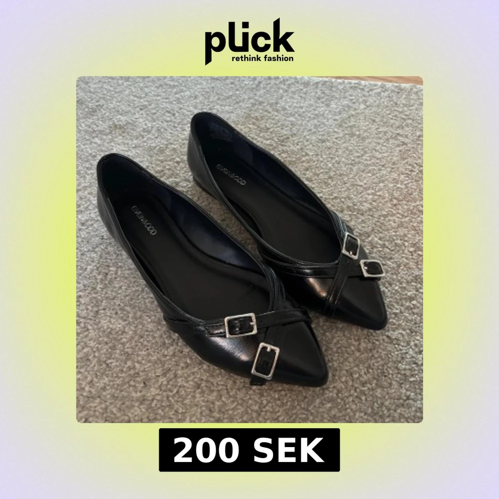 Supersnygga, svarta, spetsiga ballerinaskor med detaljer, i storleken 36, men passar bättre 37. Använda en gång och det är inga defekter på de, ser ut som helt nya! Från even & odd💞