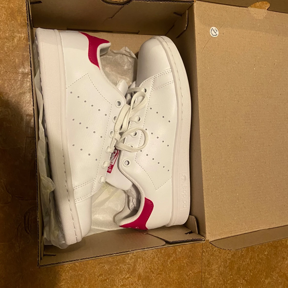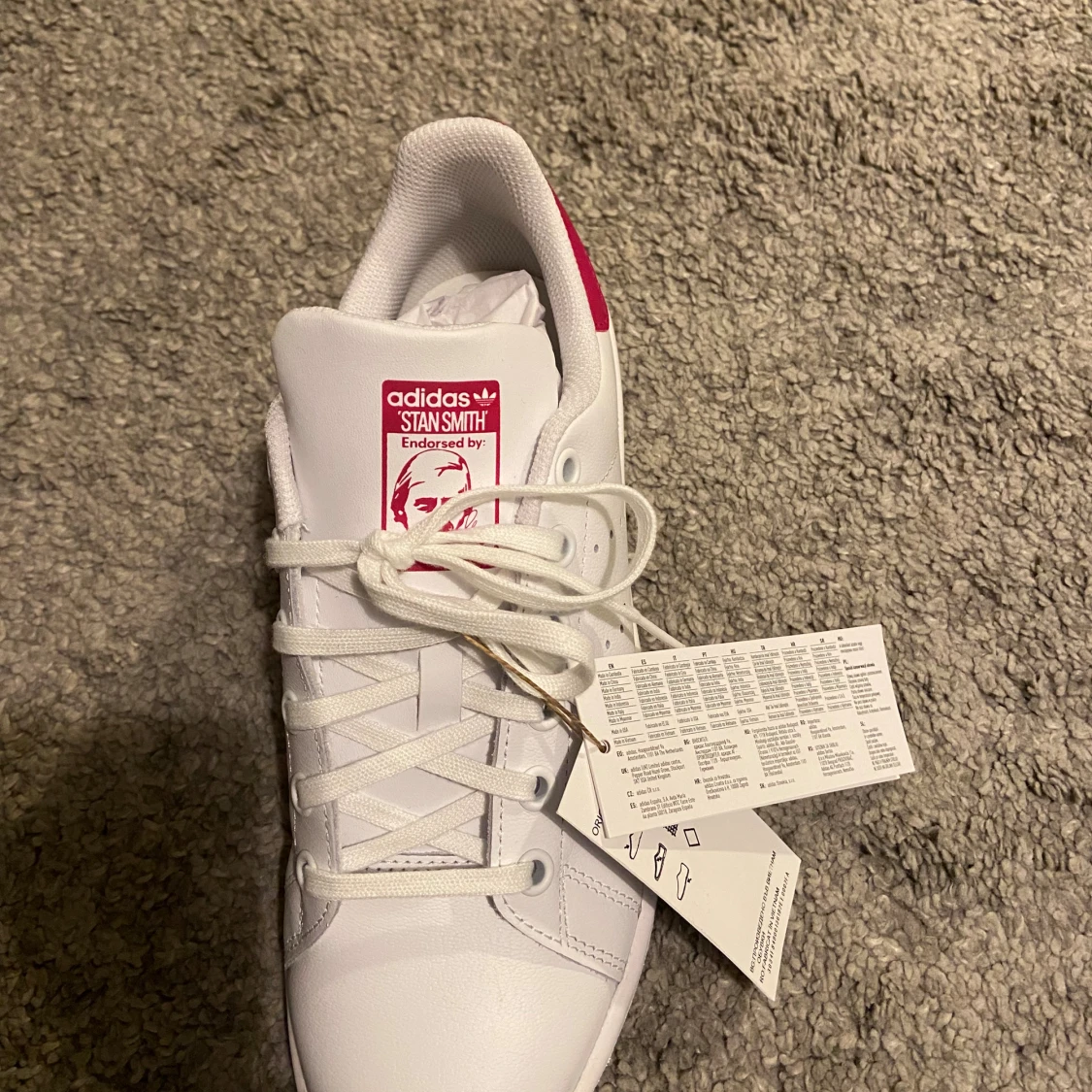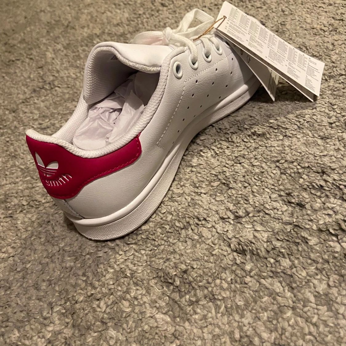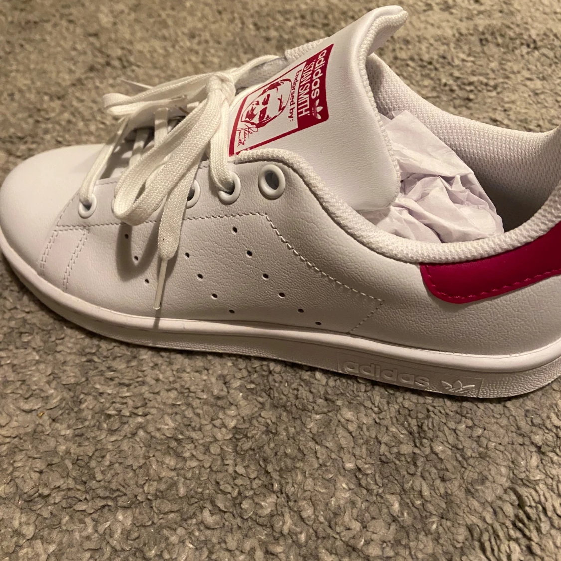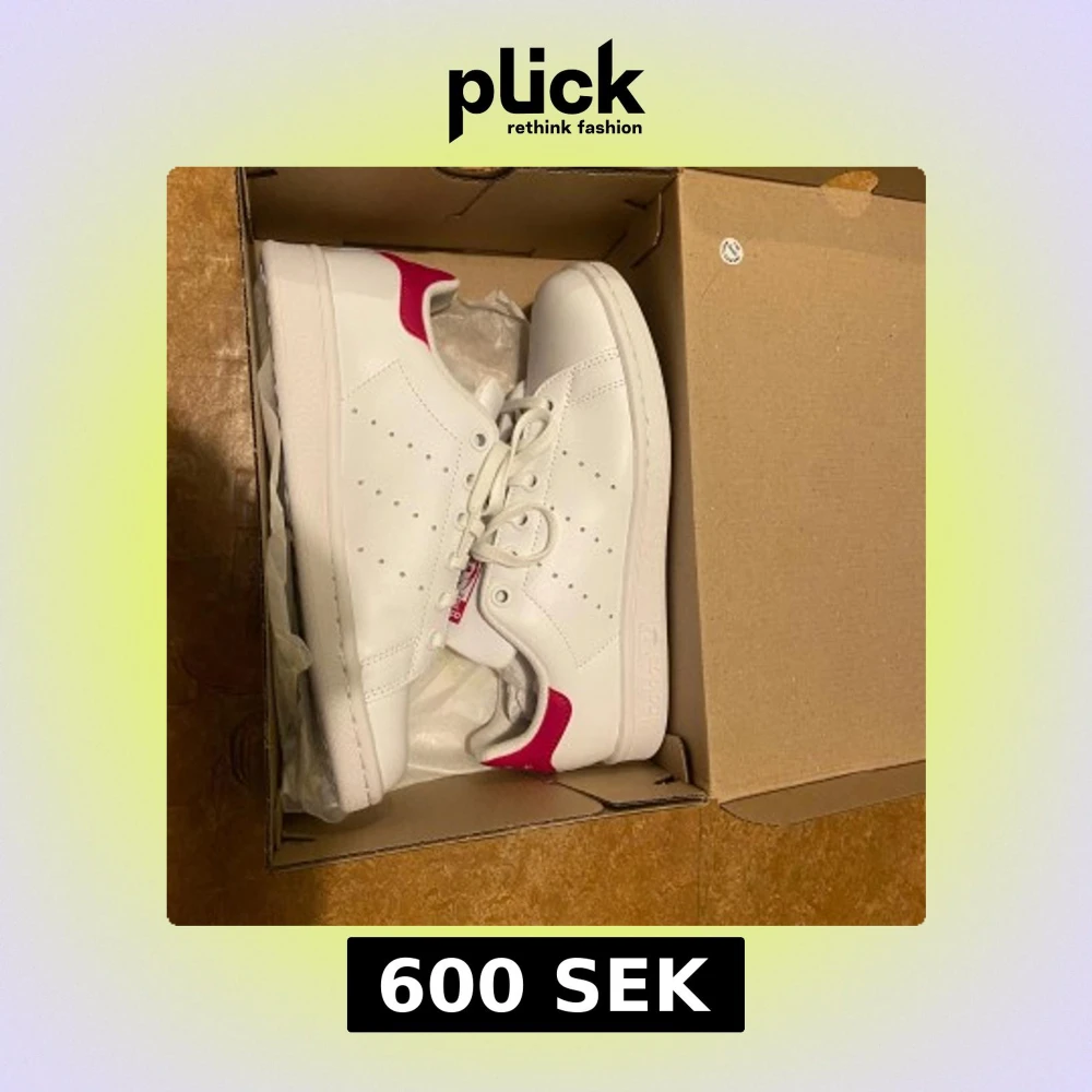 Helt oanvända med alla etiketter kvar (fel köpt, gick inte att lämna tillbaka) Adidas Stan Smith sneakers i vitt med snygga rosa detaljer på häl och plös. Klassisk låg modell med snörning. Storlek 37 1/3. Köptes för 800 kr.
