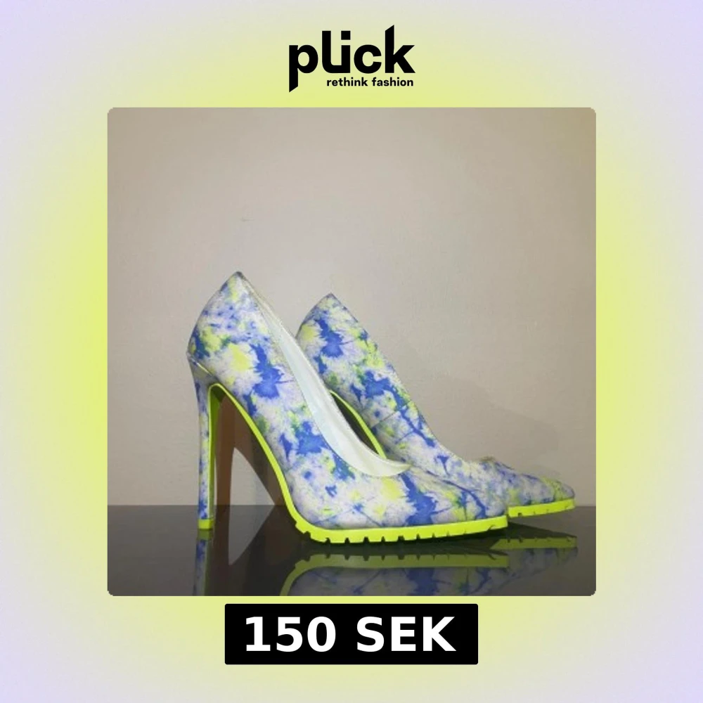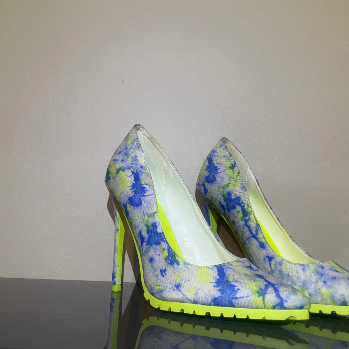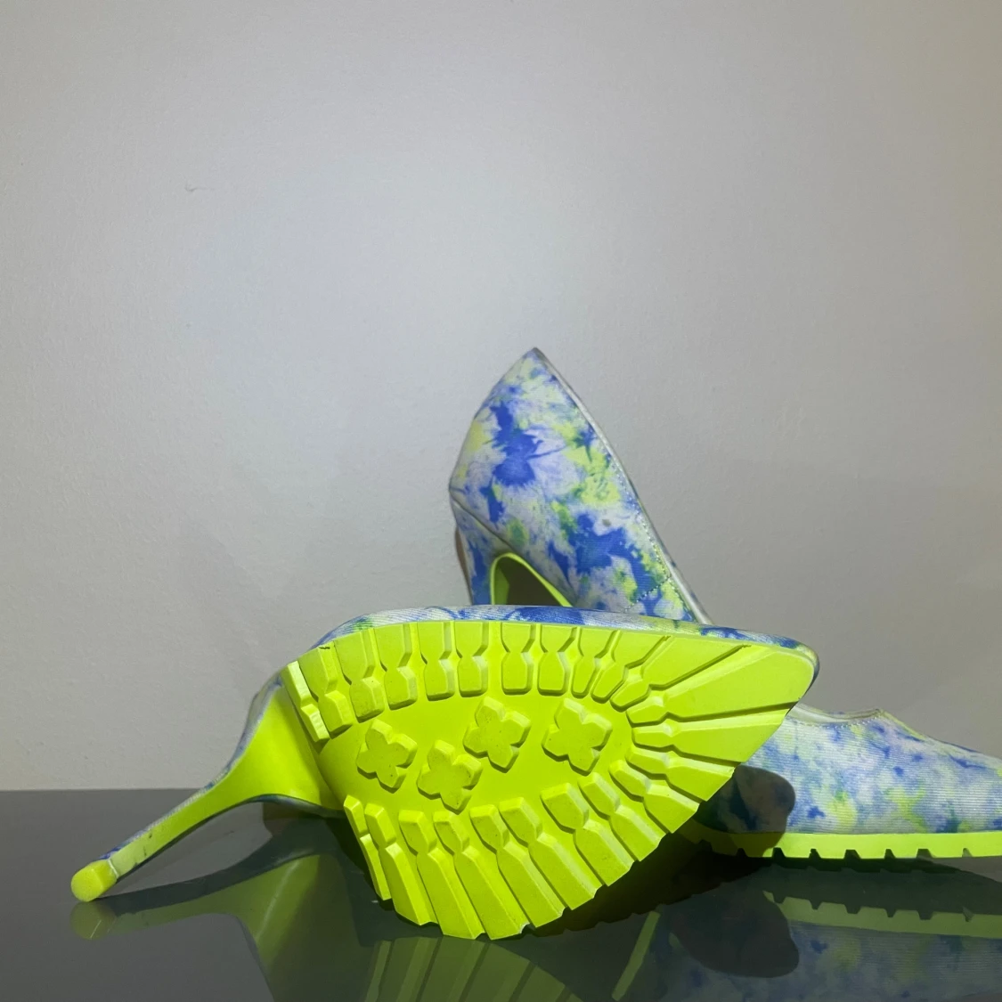 Unika pumps med höga klackar och spetsig tå. Skorna har ett färgstarkt mönster i blått, gult och vitt, samt en neongul sula med grovt mönster undertill. Perfekta för dig som vill sticka ut med din stil.