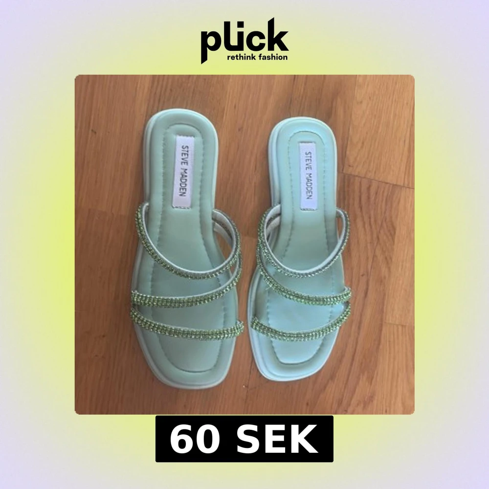 Snygga mintgröna sandaler från Steve Madden med fyrkantig tå och tre tunna remmar dekorerade med gröna glittriga stenar. Platt sula och öppen tå ger en fräsch och trendig look, perfekt för varma dagar.