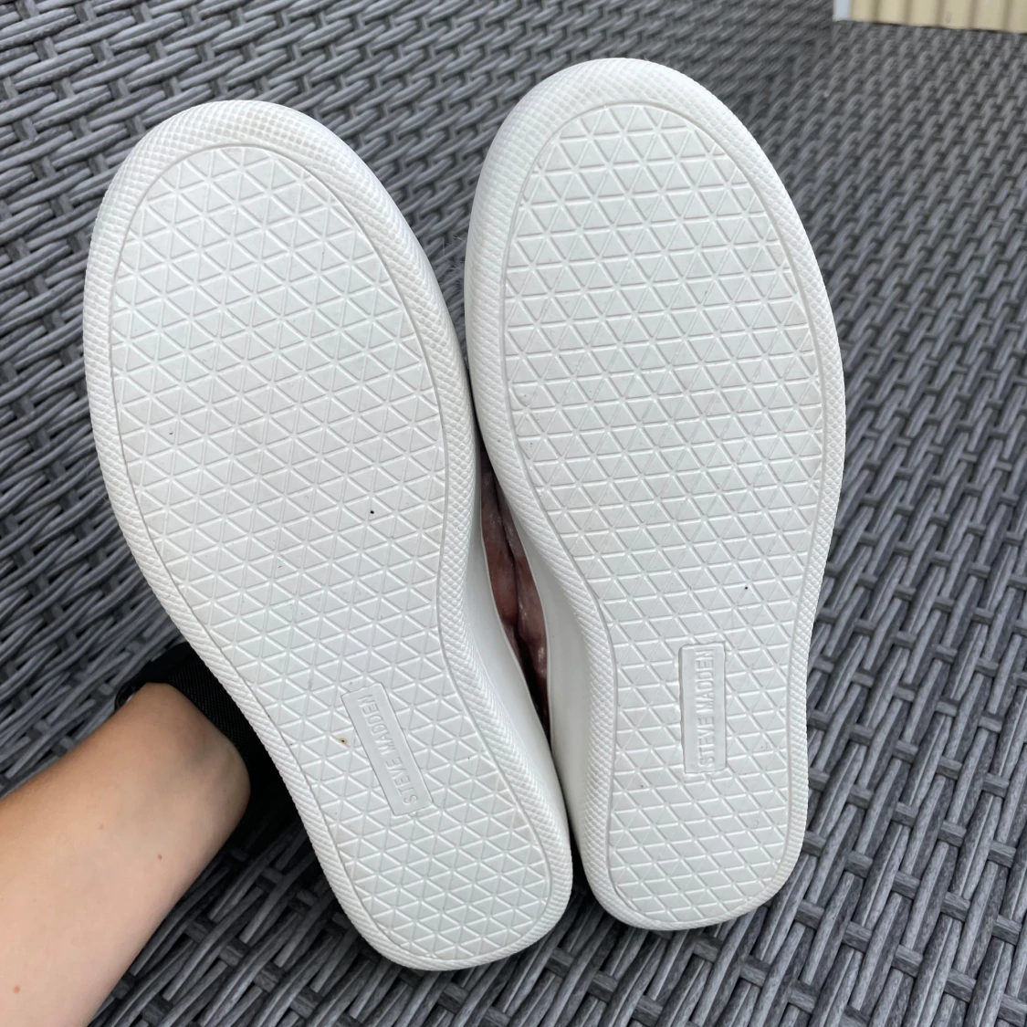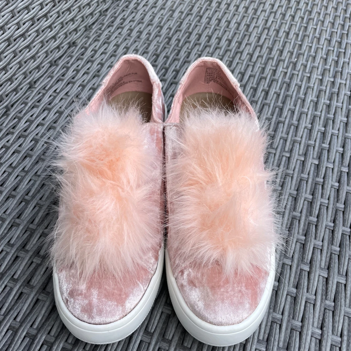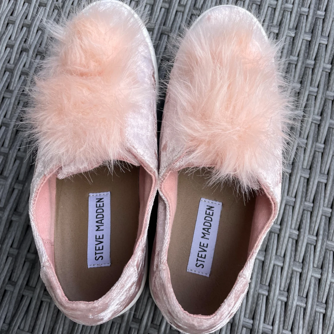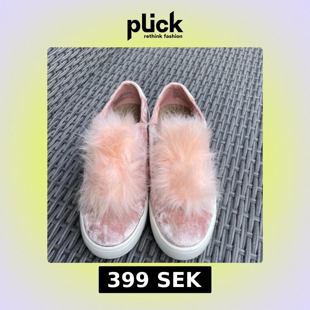 Unika sneakers från Steve Madden i ljusrosa sammet med fluffig ljusrosa pälsdetalj på ovansidan. Skorna har vit platt sula och slip-on-modell, perfekta för dig som vill sticka ut. Aldrig använda. Storlek 36