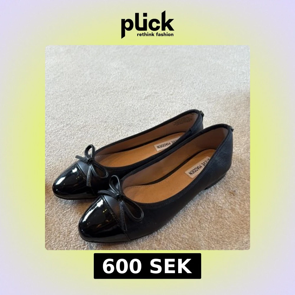 Snygga svarta ballerinaskor från Steve Madden med lackad tå och söt rosettdetalj framtill. Skorna har rund tå och platt sula, tillverkade i skinnimitation med en glansig finish på tån. Perfekta för dig som gillar klassisk och stilren look.