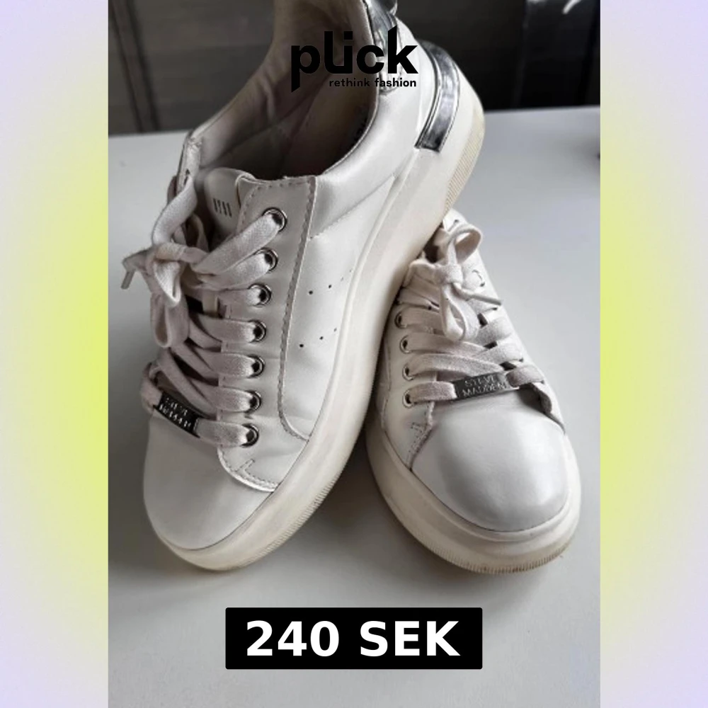 Snygga vita sneakers från Steve Madden med silvriga detaljer på hälen och metallplatta med logga på snörningen. Skorna har rund tå, platt sula och är tillverkade i skinn med textilfoder. Perfekta för en clean och trendig look.