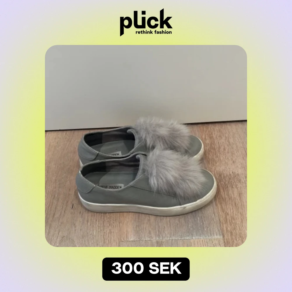 Ett par jättesöta gråa steve madden skor med två fluffbollar på. Skicket är väldigt bra då jag inte annvänt de särskilt mycket, men sulan är lite smutsig men det går lätt att tvätta!Står ingen storlek i men passar 38-39❤️🔥