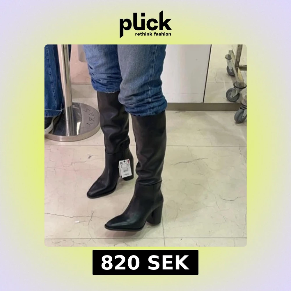 Säljer ett par svarta höga stövlar i skinn med snygg spetsig tå och klack. Stövlarna går upp till knäet och har en stilren, minimalistisk design som passar till jeans eller kjol. Använda ett par gånger men fortfarande som nyskick. Ca 8cm klack. 100% skinn, från Zara, nypris: 1800kr.