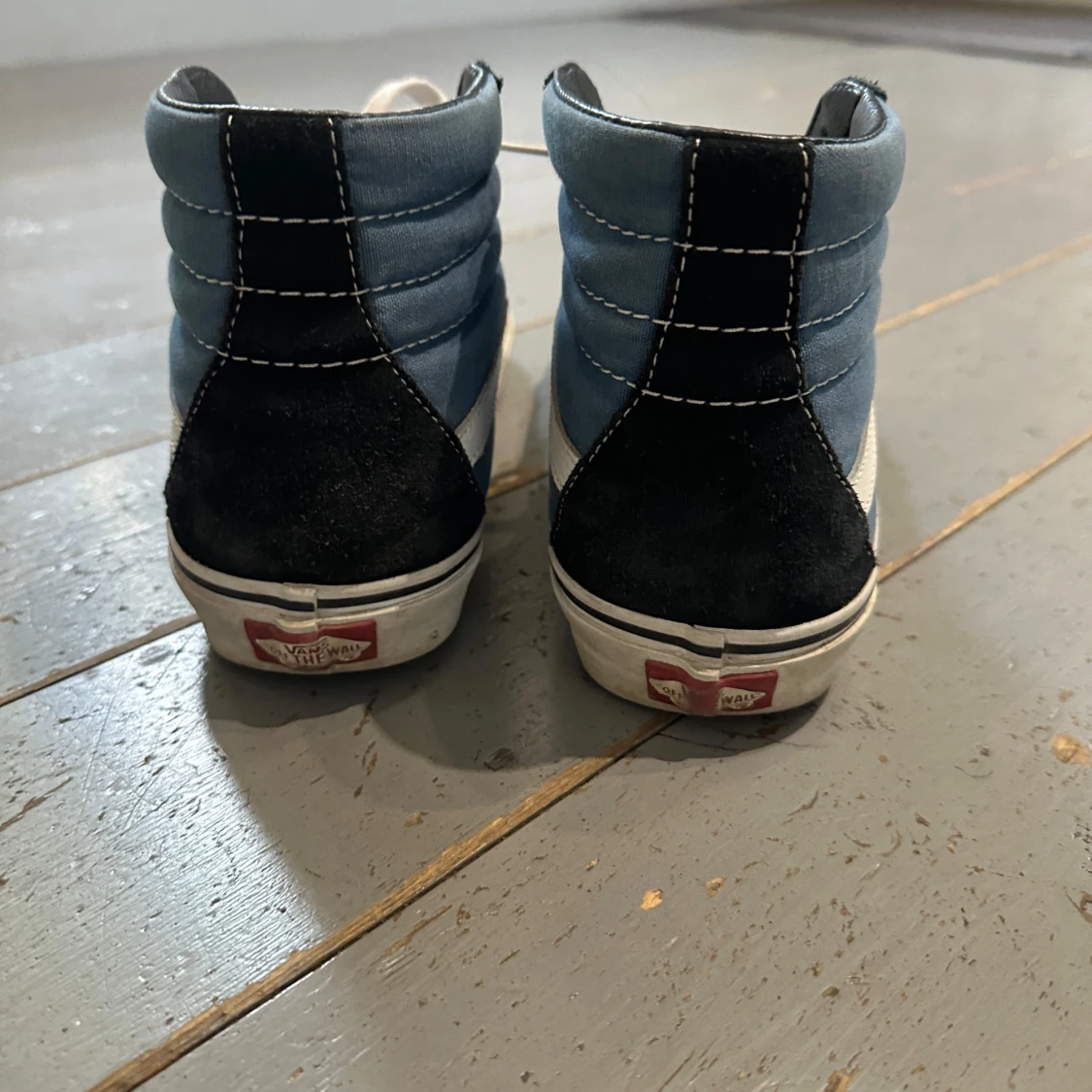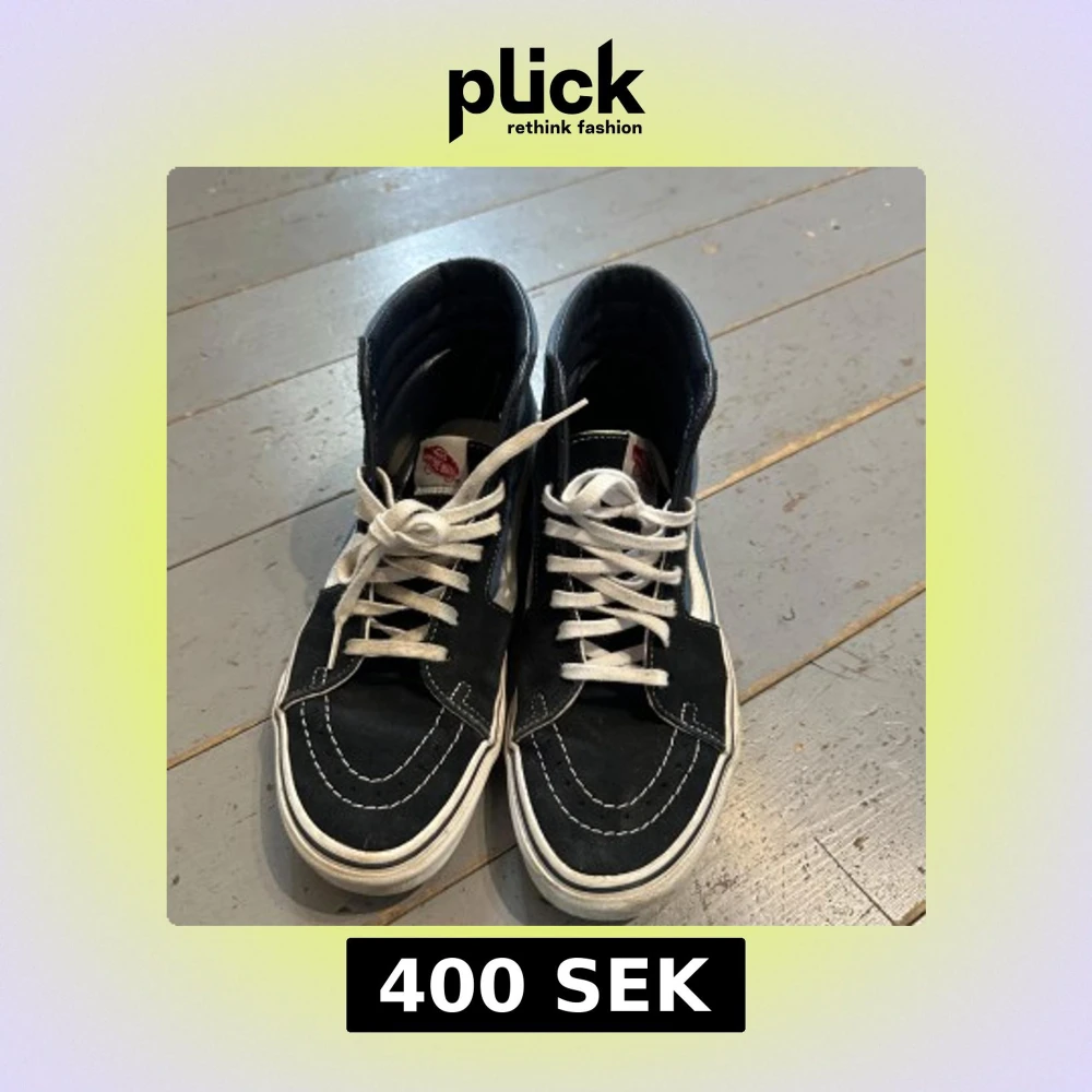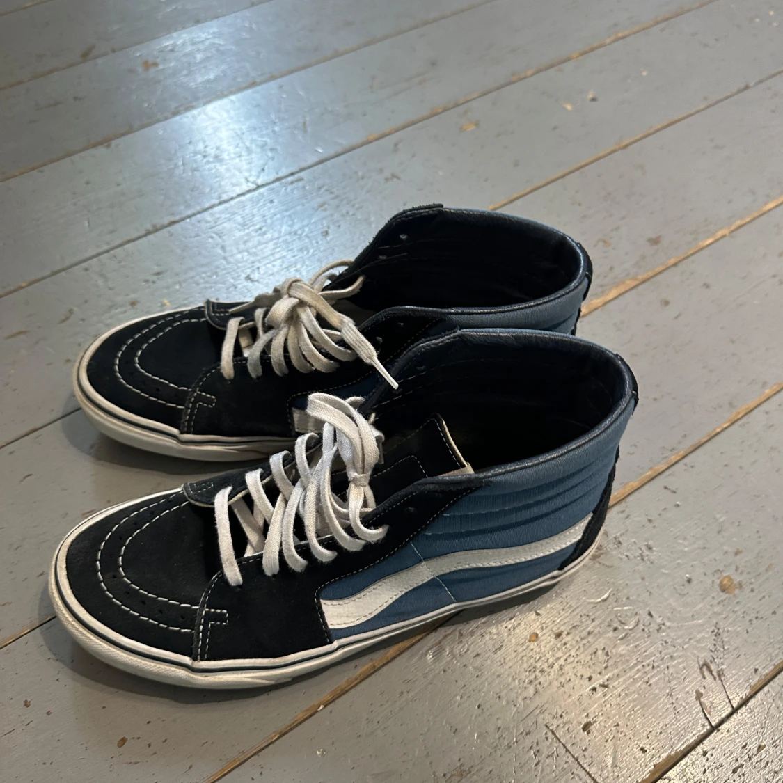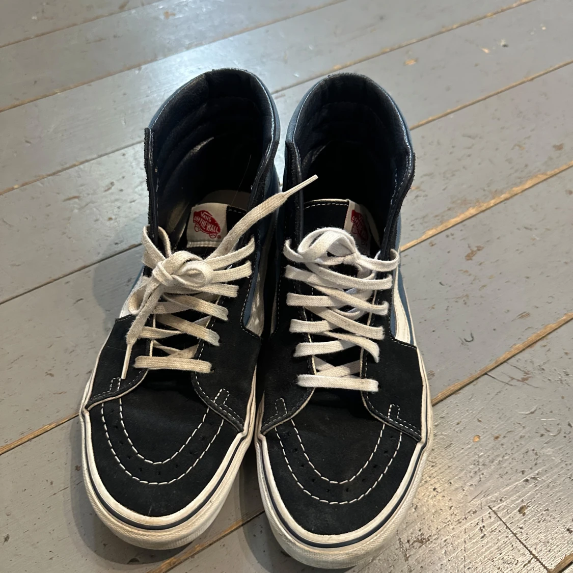 Säljer ett par Vans sneakers i klassisk blå och svart färg med vit sula och vit sidostripes. Skorna har högt skaft, rund tå och snörning med vita skosnören. Jag köpte de på vinted, endast använda 1 gång.