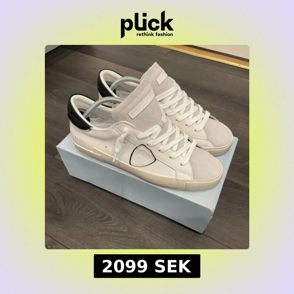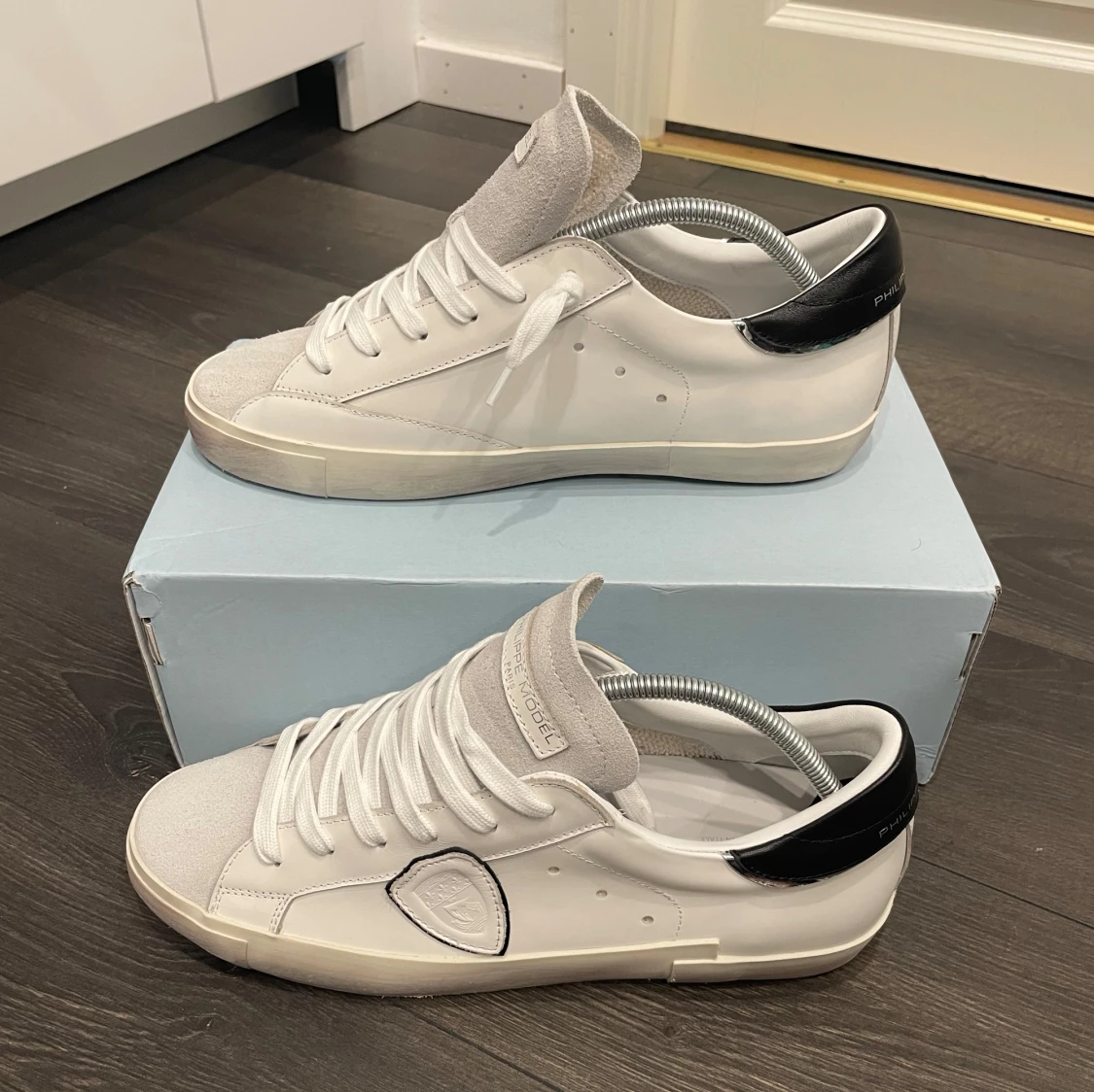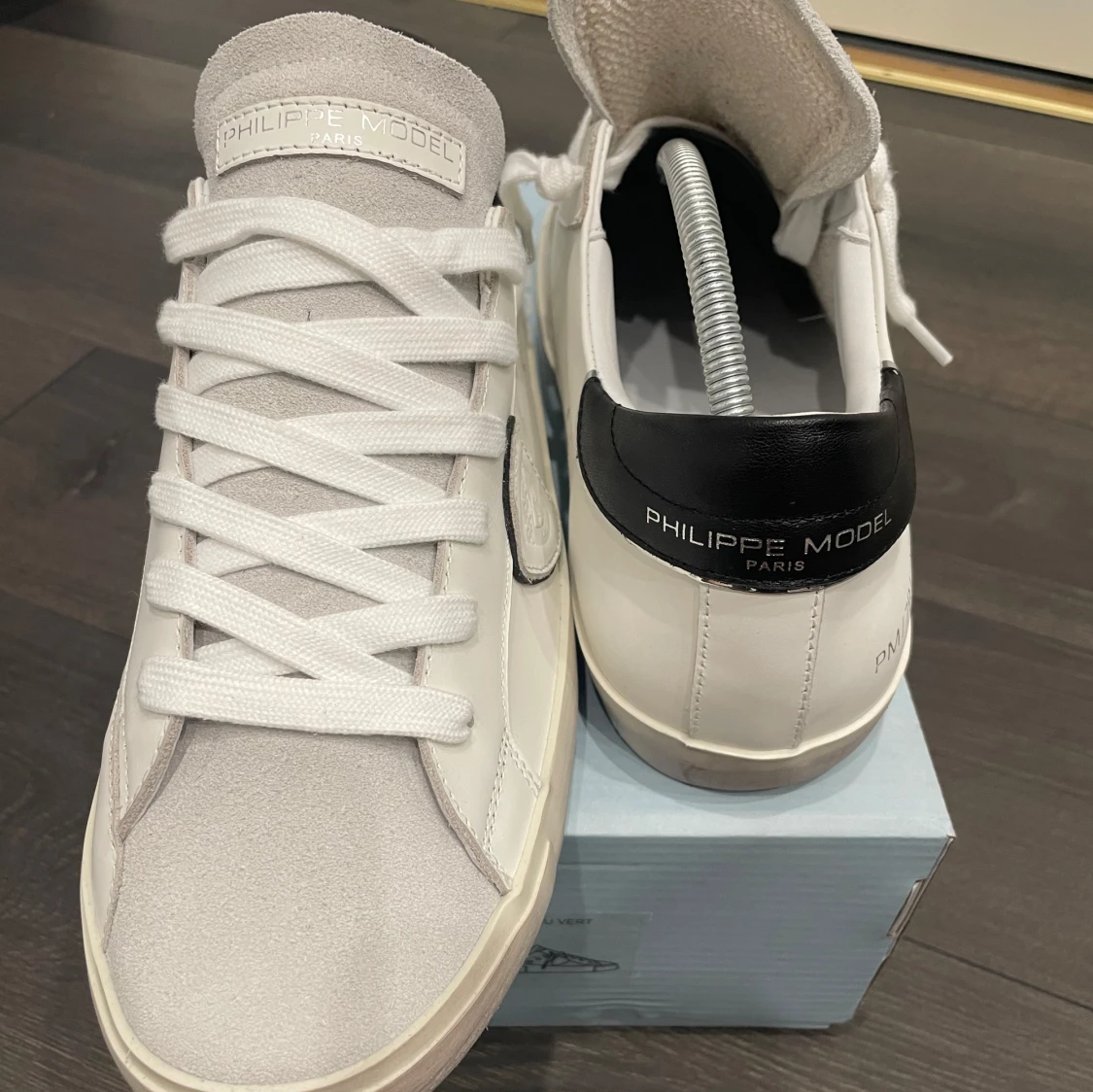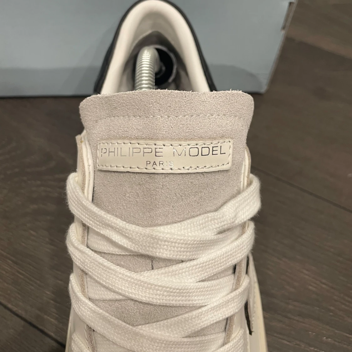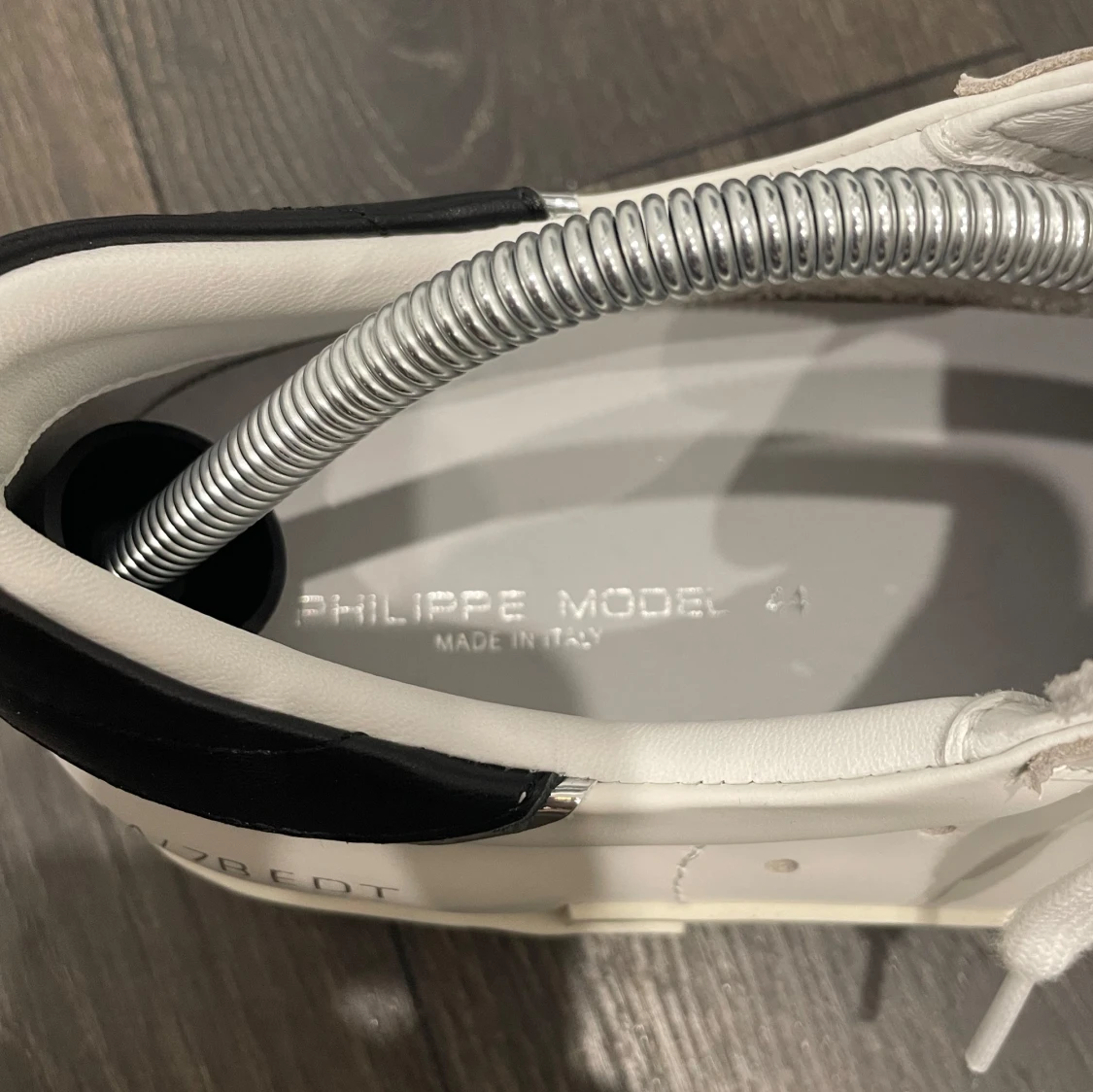 Säljer ett par snygga vita Philippe Model sneakers med svarta detaljer på hälen och vit snörning. Skorna har en kombination av mocka och skinn, skorna är HELT NYA! och aldrig använda bara testade. Priset är ej hugget i sten så kom gärna med förslag! Säljer de då jag behöver pengar😞