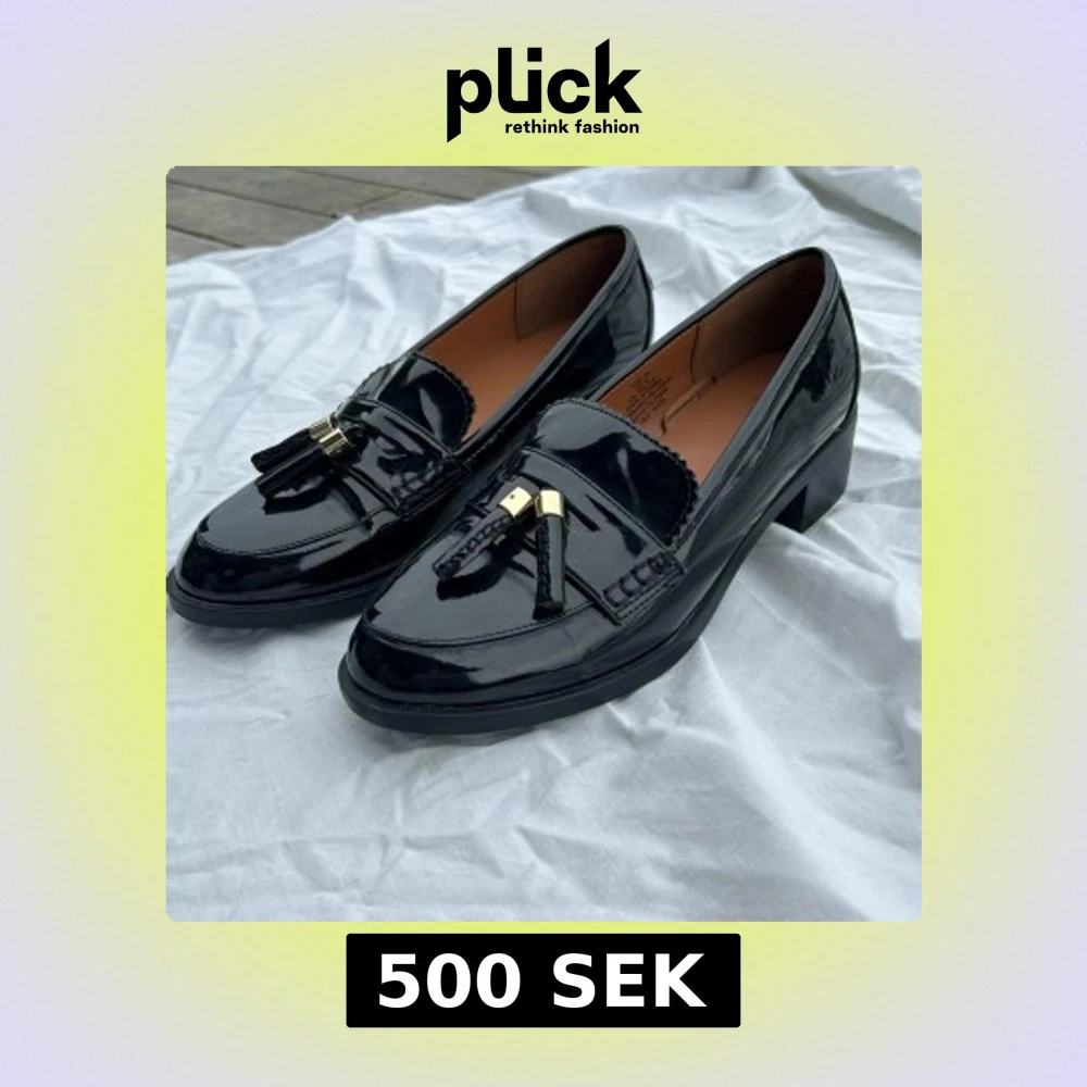 Snygga svarta loafers i lack från H&M med dekorativa tofsar och gulddetaljer. Perfekta för en stilren look.