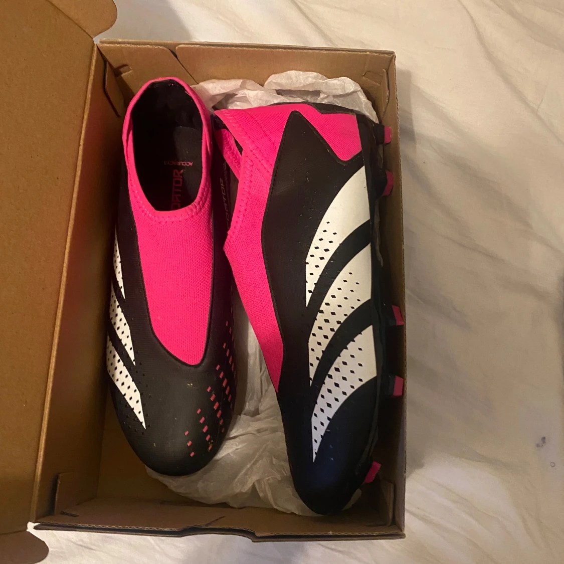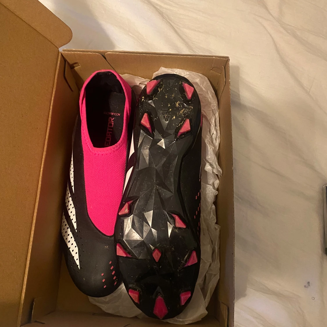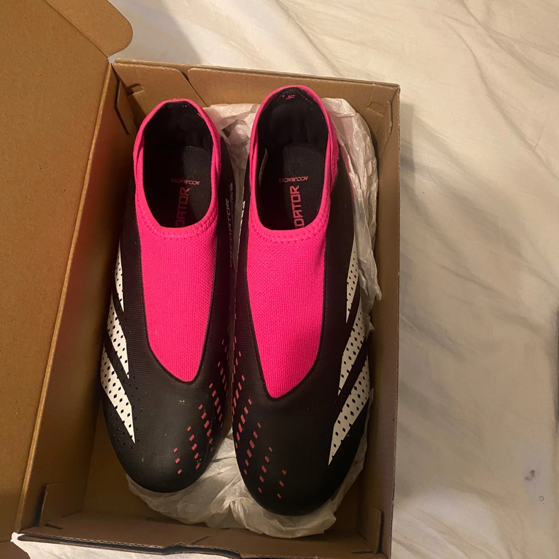 Snygga fotbollsskor från Adidas i svart och rosa med vita detaljer. Skorna har en strömlinjeformad design med en tight passform och är perfekta för fotbollsplanen. De har en slitstark sula med dobbar för optimalt grepp. Jag har använd 2gng