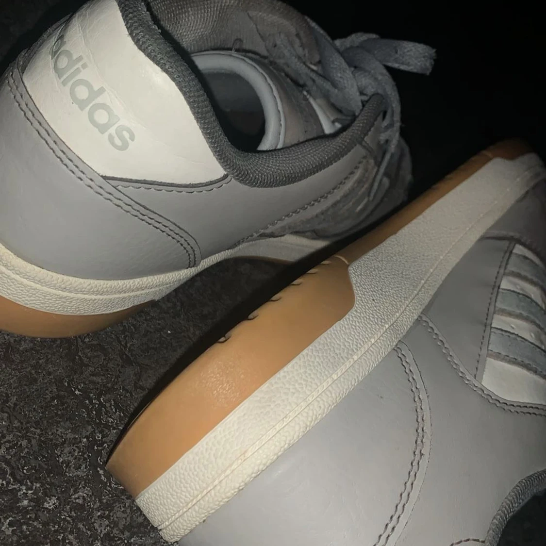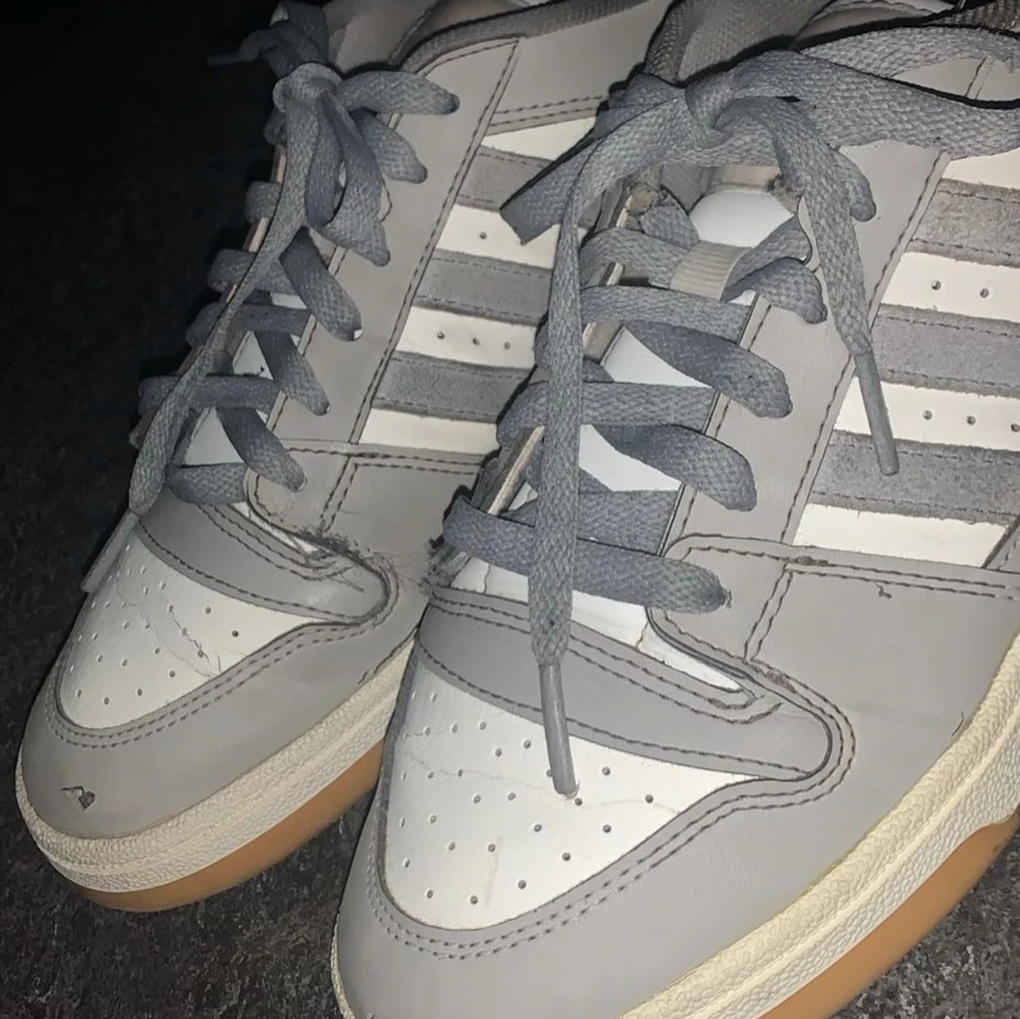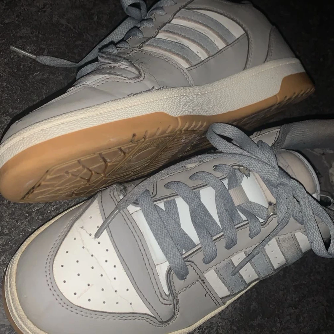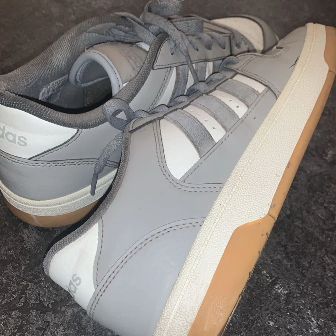 Snygga grå och vita sneakers från Adidas med klassiska ränder på sidan. Skorna har en gummisula i beige och snörning framtill. Perfekta för en avslappnad stil.