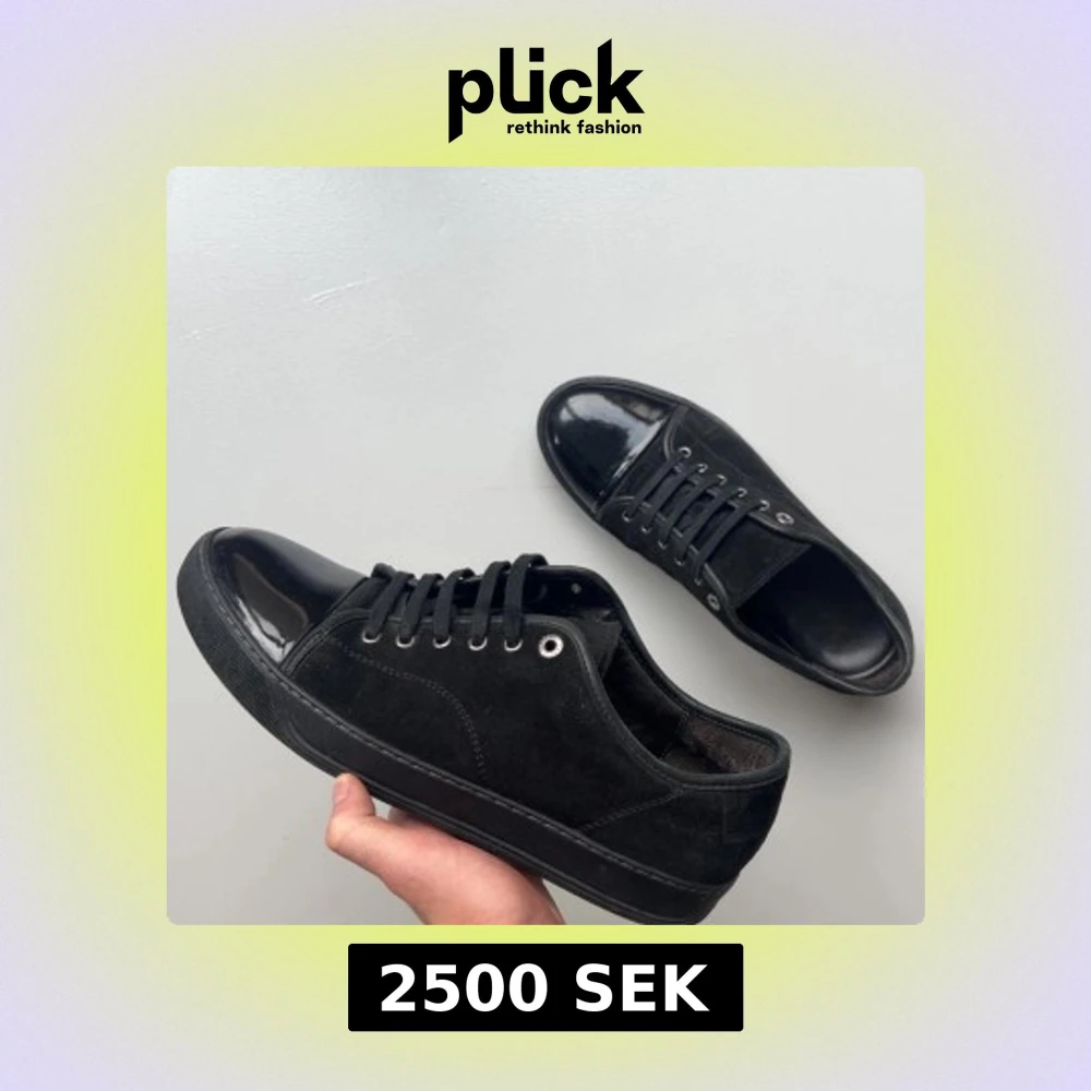 Säljer ett par svarta Lanvins med snygg kombination av mocka och lackdetaljer på tån. Skorna har rund tå, snörning och platt sula. Perfekta för dig som gillar stilrena och lyxiga detaljer i din outfit.