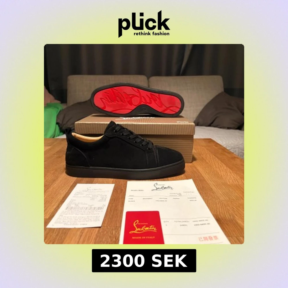 Svarta sneakers från Christian Louboutin i mocka med klassisk röd sula och diskret broderad logga på hälen. Snygg och stilren design med snörning och rund tå. Insidan är ljusbeige och skon har en platt sula. Perfekt för dig som vill sticka ut med exklusiva detaljer.