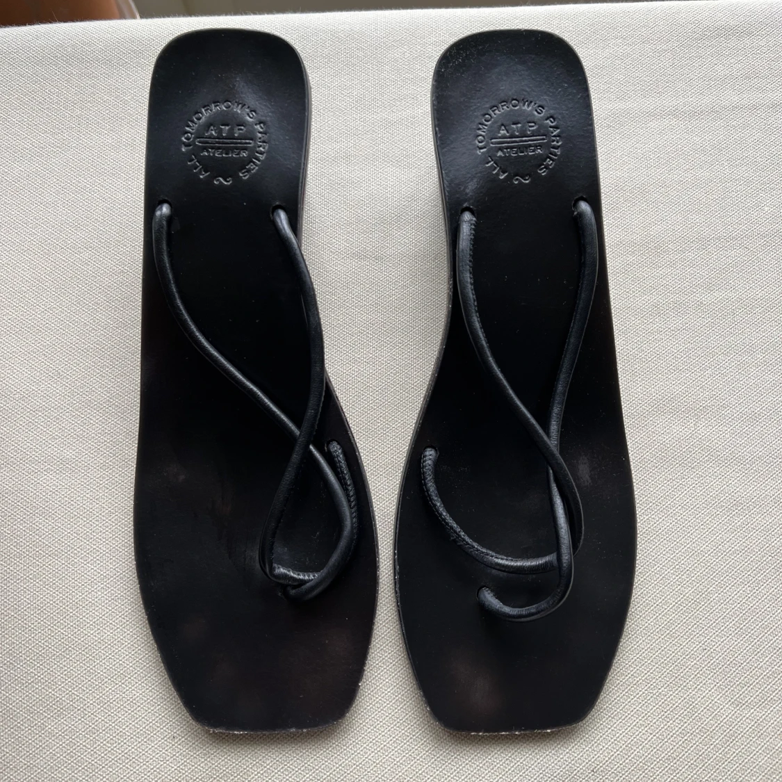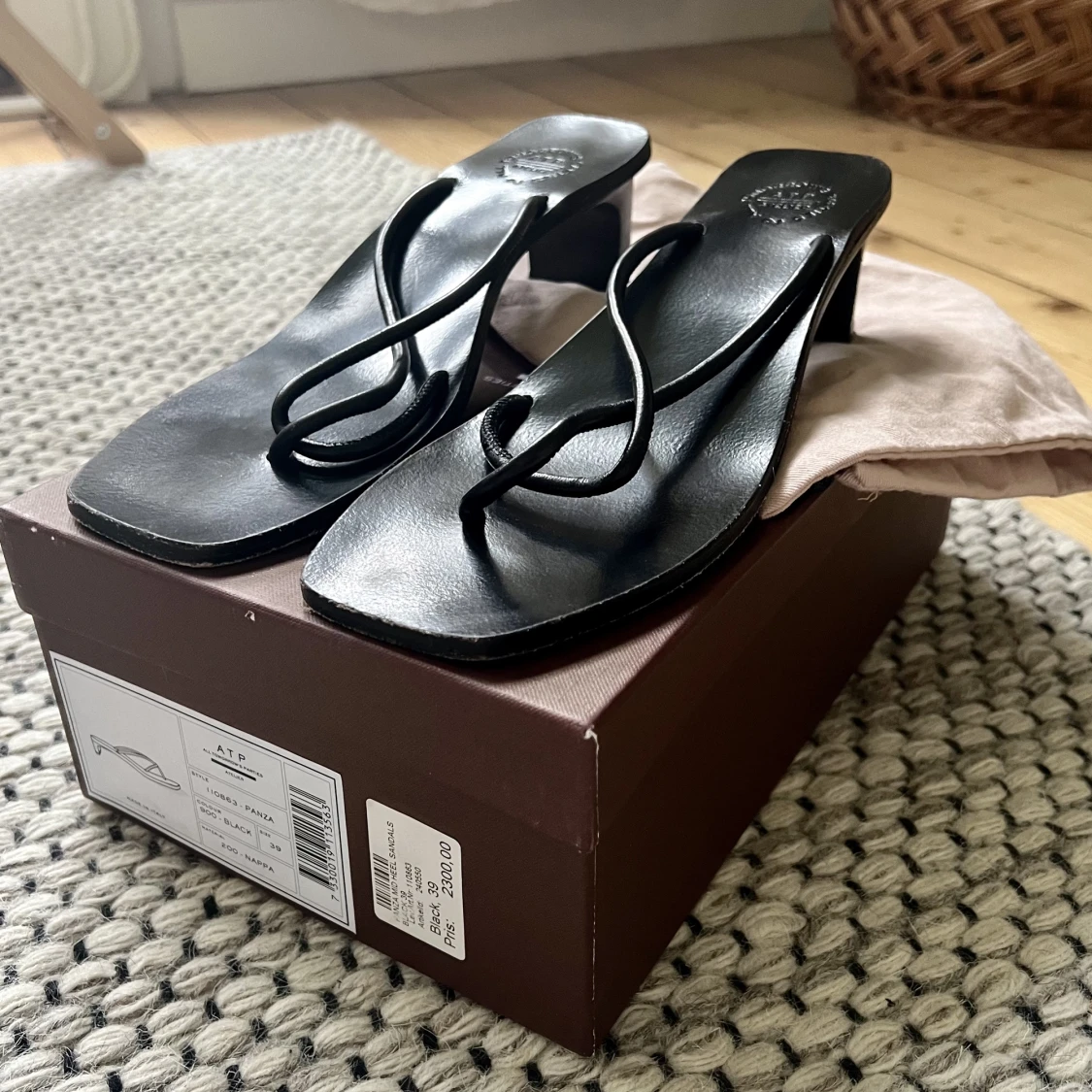 ATP Panza Strappy Sandal i svart. Storlek 39. Bra skick, skon är i trä och därav slits sulan snabbt undertill. Köpta för 2300kr på Vallgatan 12 i Göteborg.