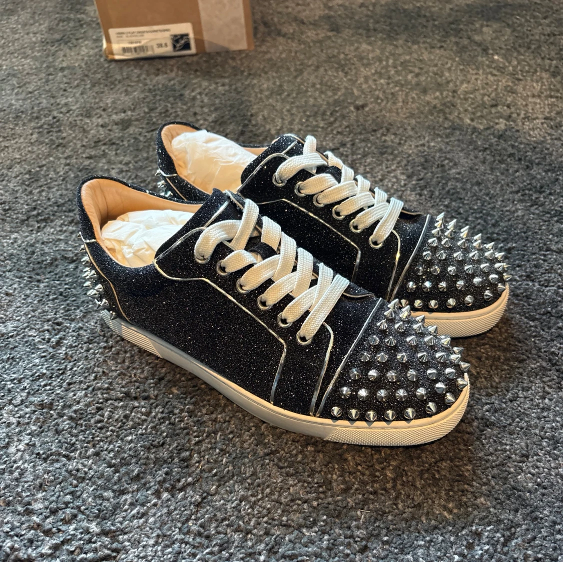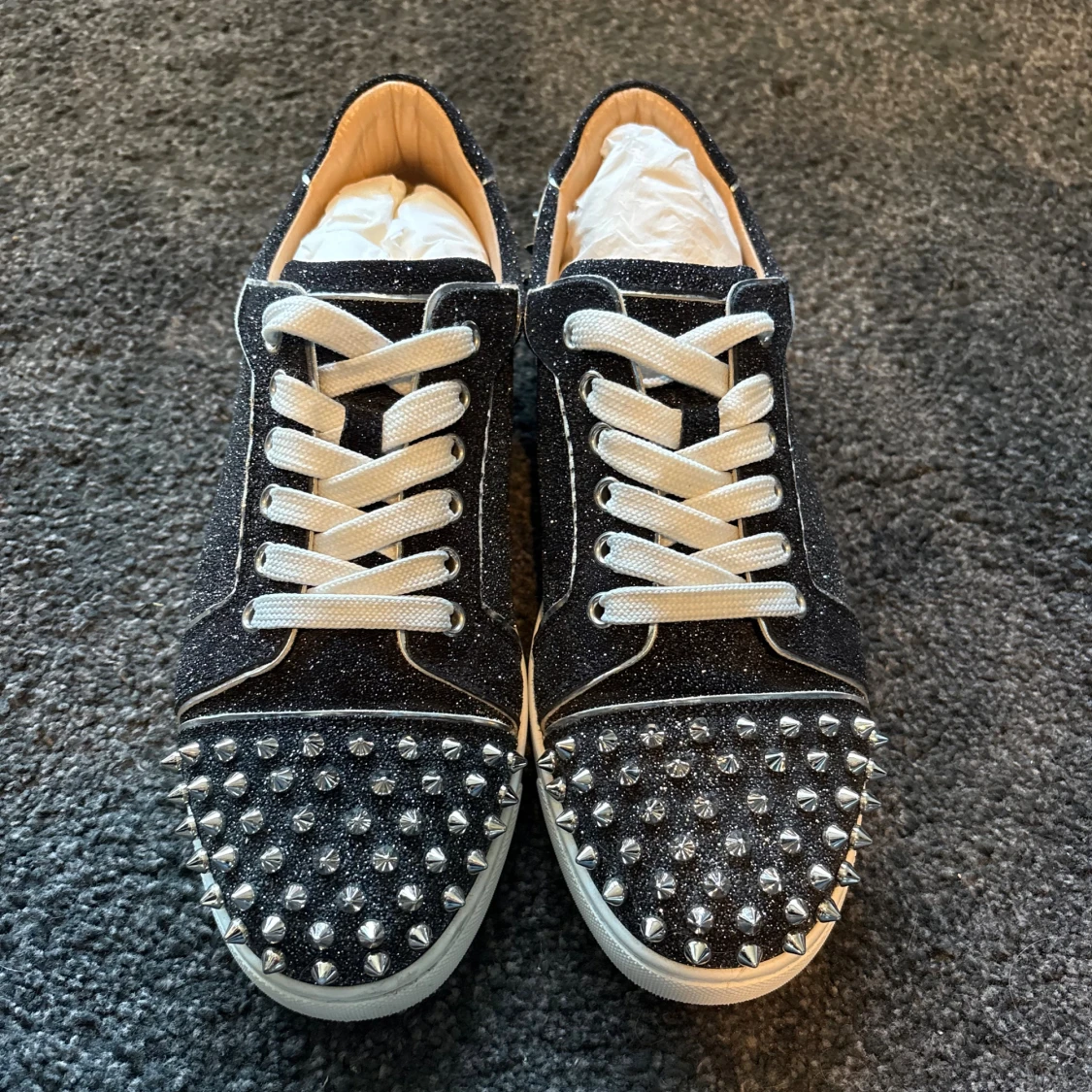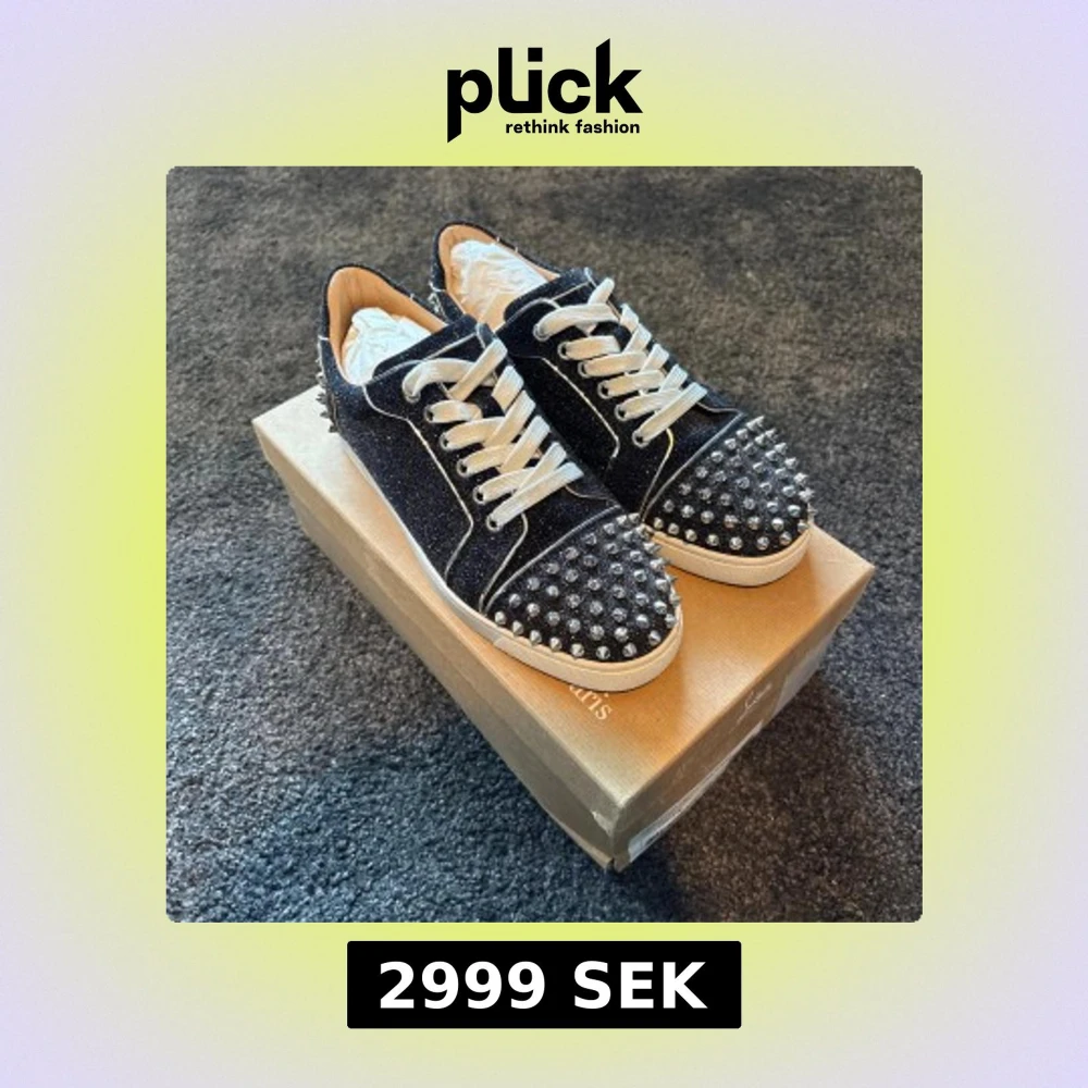 Säljer ett par svarta glittriga sneakers från Christian Louboutin med vita snören och silverfärgade nitar på tå och häl. Skorna är i jättefint skick (9,5/10)! Alla tillbehör följer med!