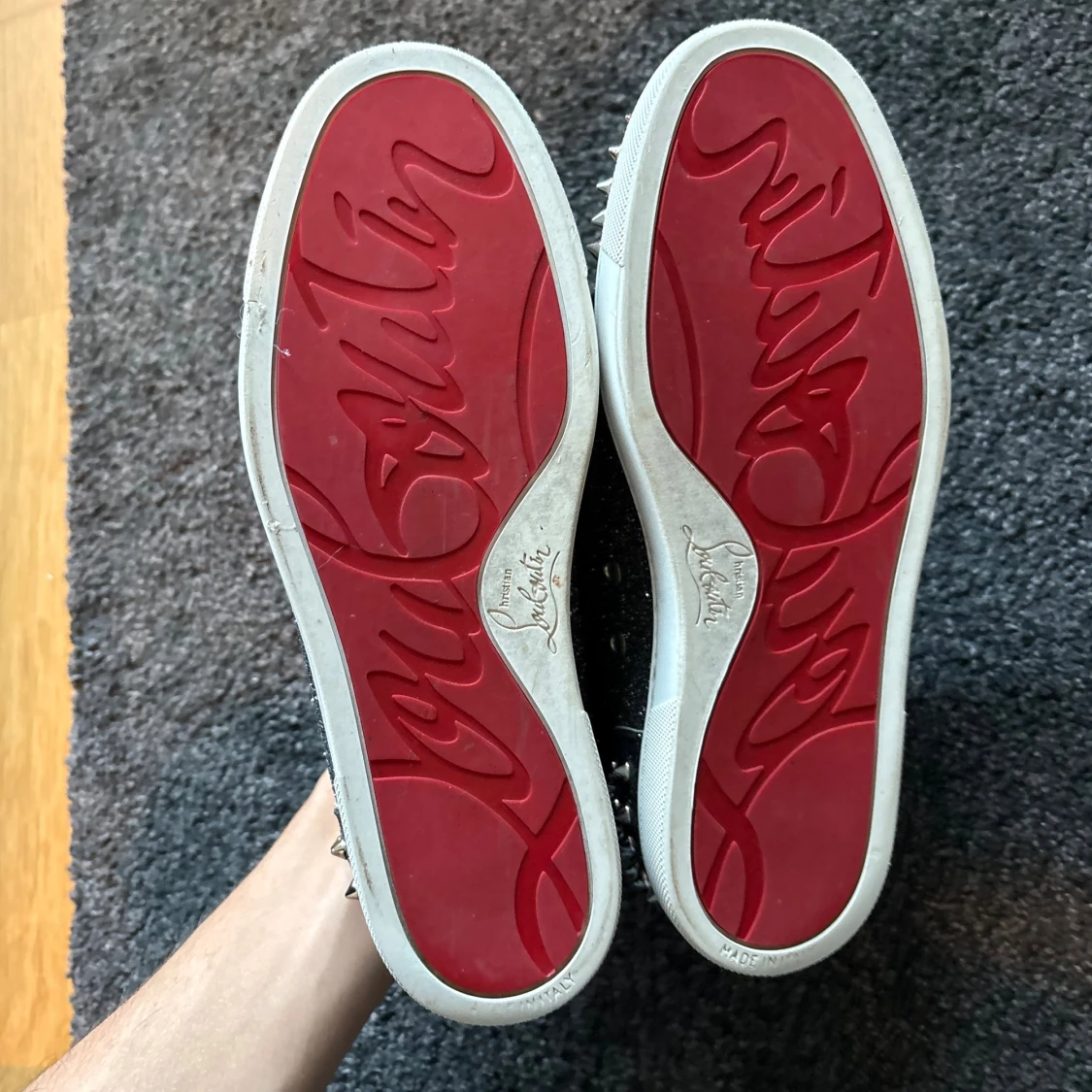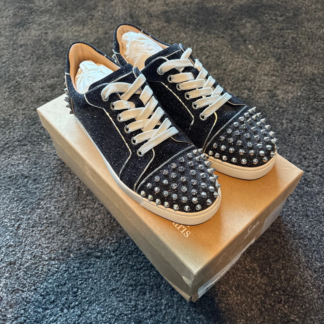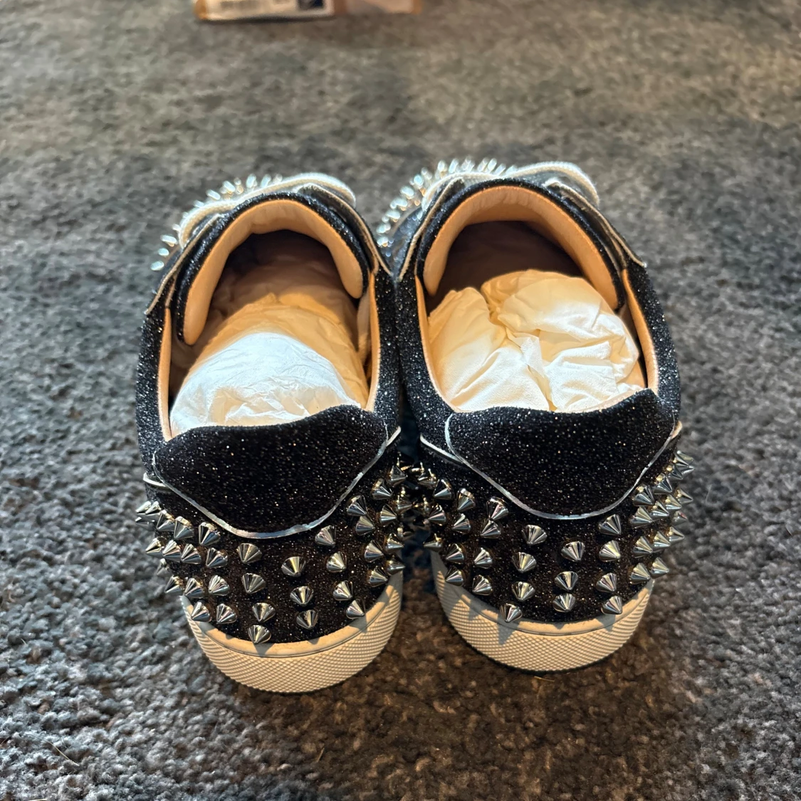 Säljer ett par svarta glittriga sneakers från Christian Louboutin med vita snören och silverfärgade nitar på tå och häl. Skorna är i jättefint skick (9,5/10)! Alla tillbehör följer med!