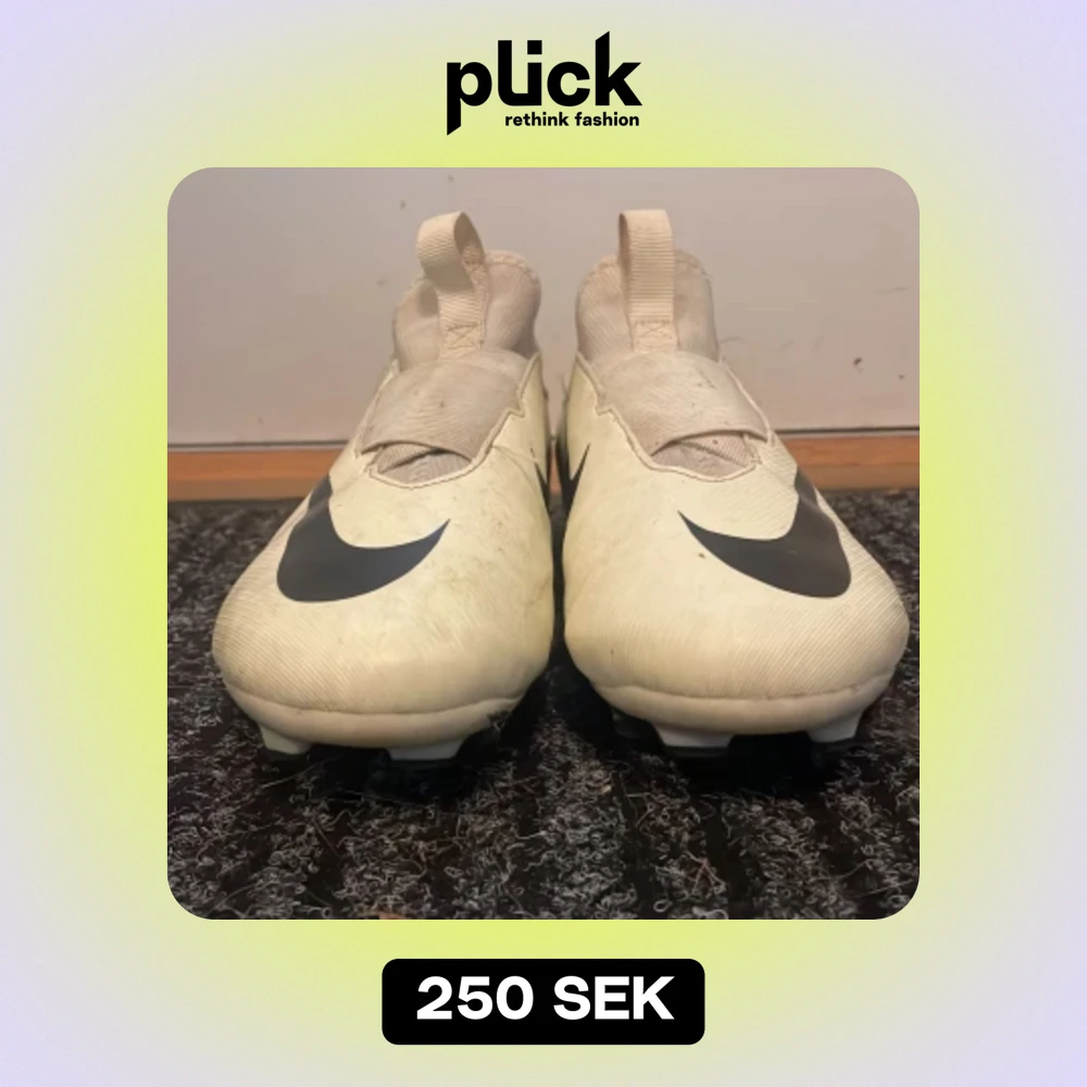Säljer ett par Nike Mercurial fotbollsskor i vitt med svarta detaljer. Skorna har en strömlinjeformad design med Nike-loggan tydligt synlig på sidan. De är utrustade med Air Zoom-teknologi för extra komfort och prestanda på planen. Perfekta för fotbollsspelare som vill ha både stil och funktion.
