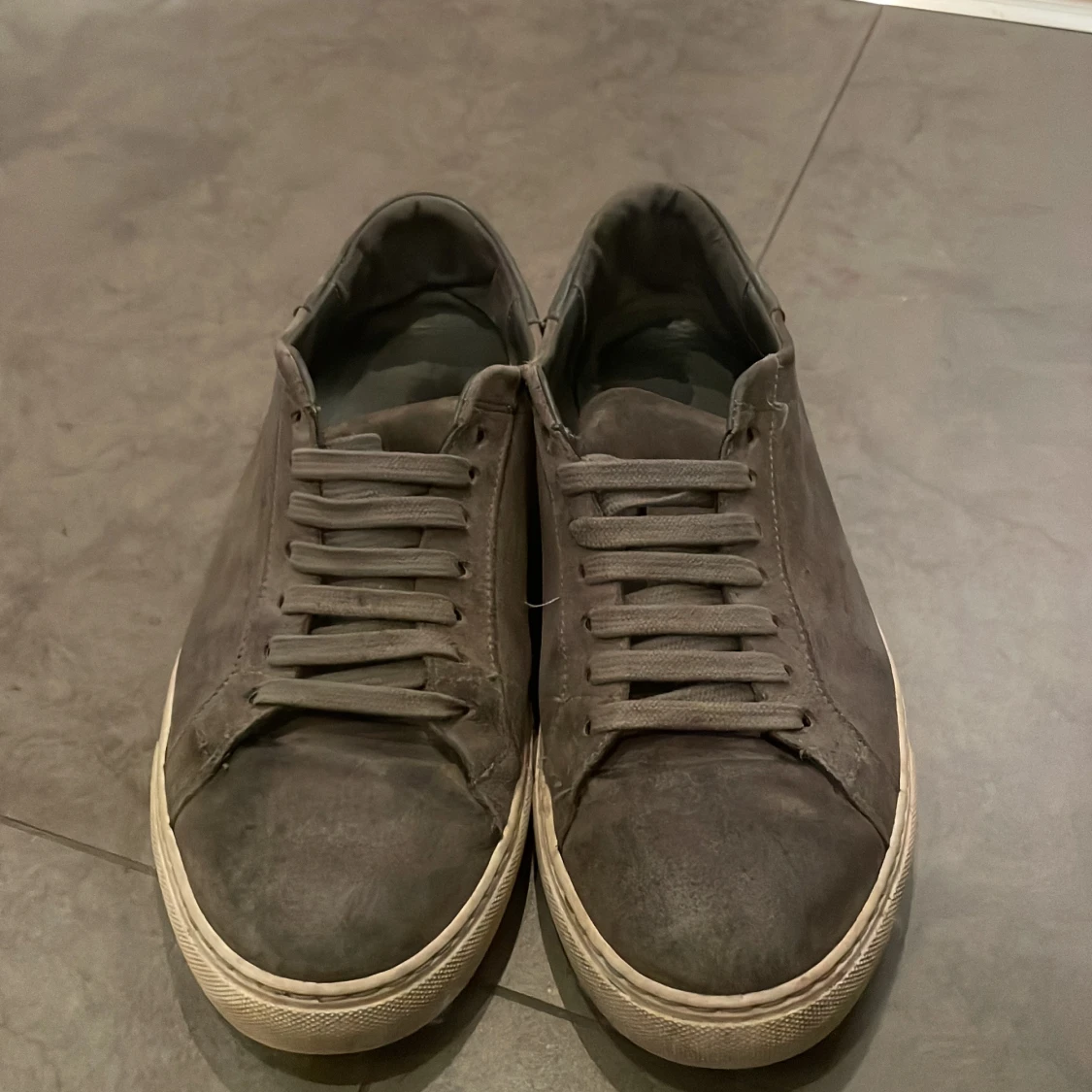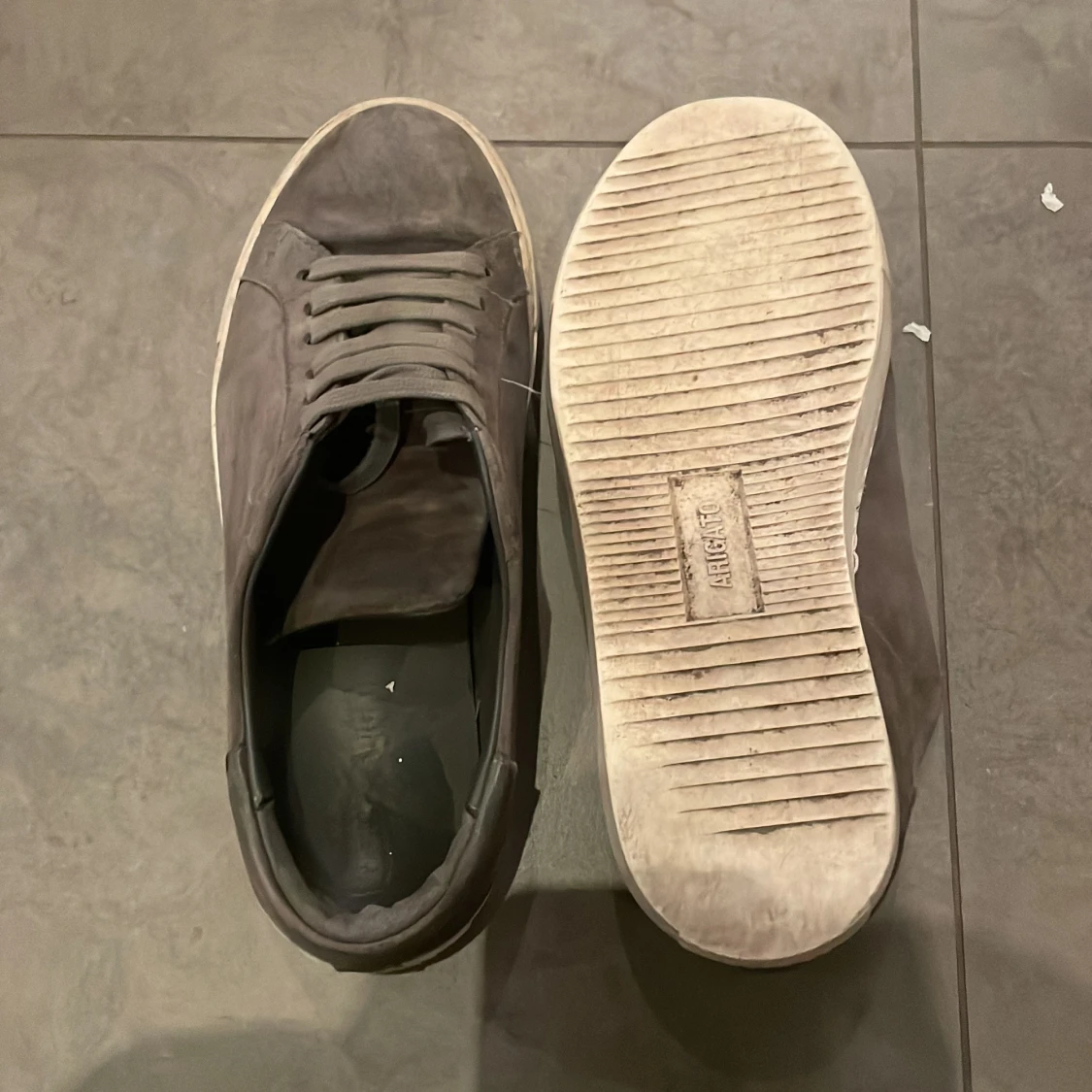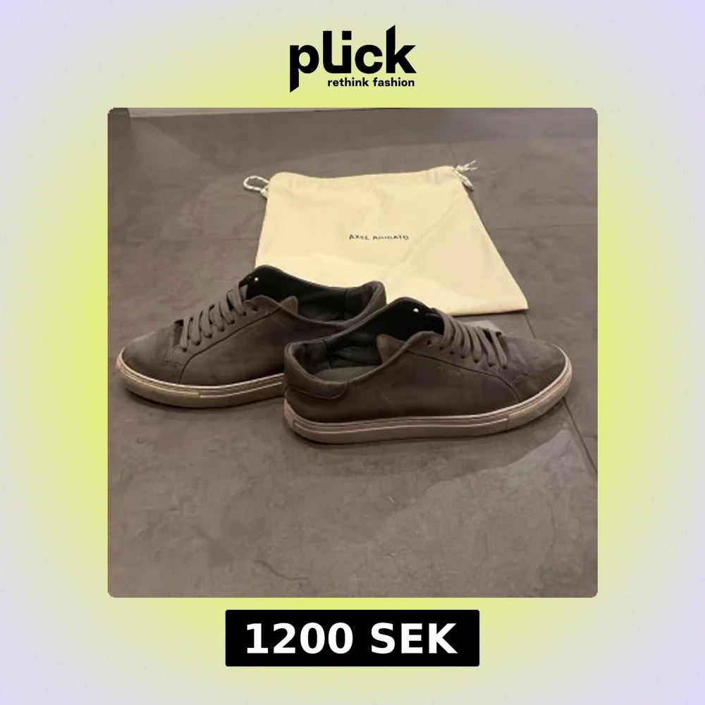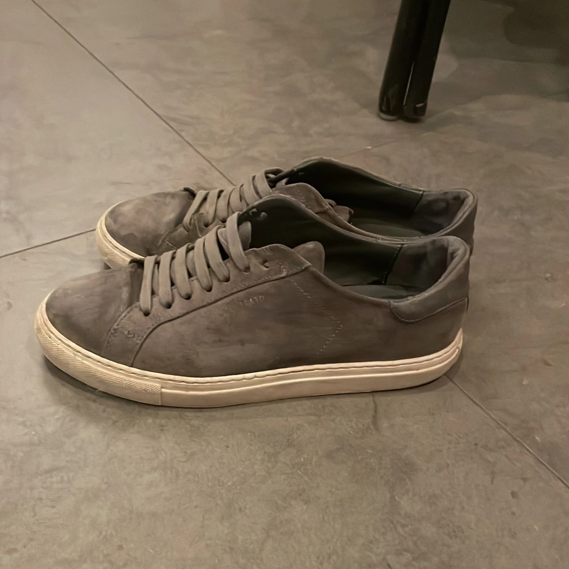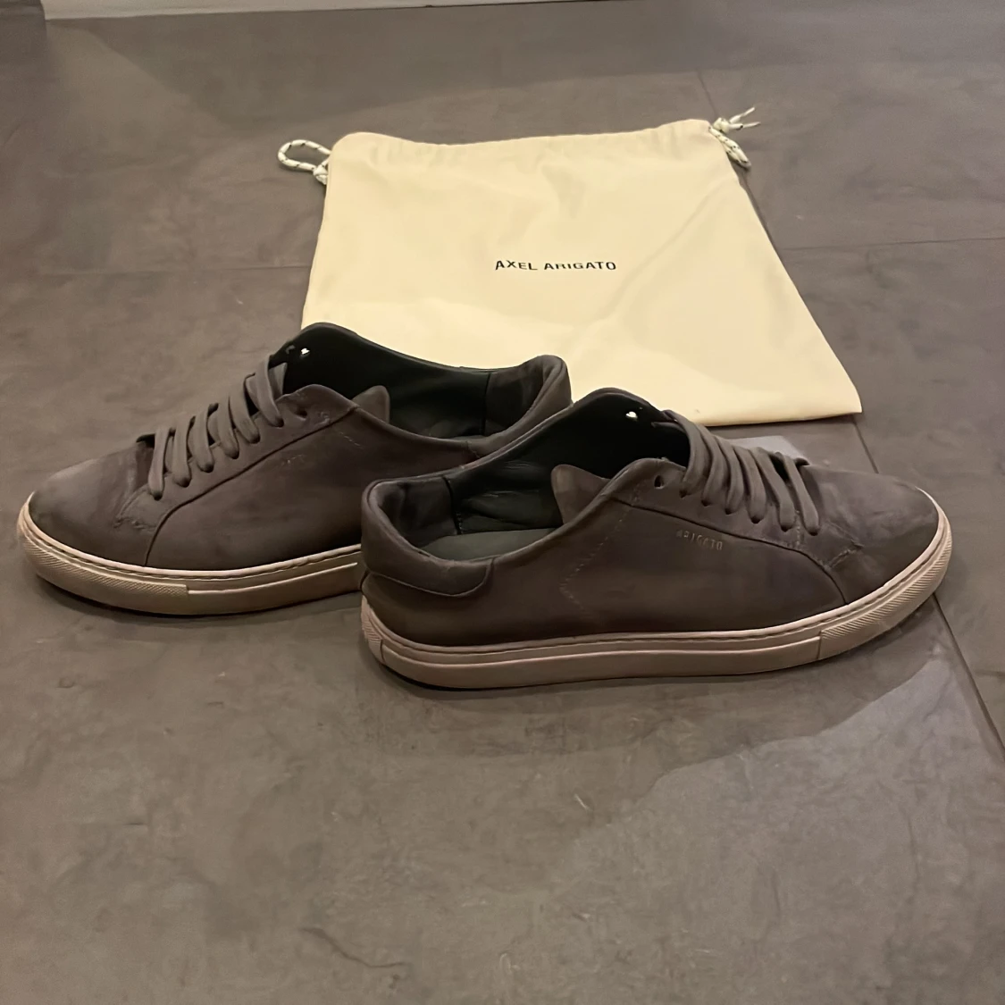 Snygga gråa sneakers från Axel Arigato i mocka med klassisk låg profil och rund tå. Skorna har matchande gråa snören och en beige sula med diskret logga på sidan. Perfekta för dig som gillar stilrena och minimalistiska skor.