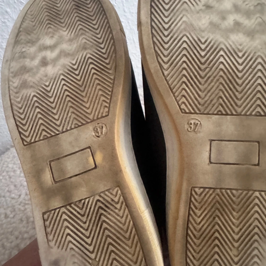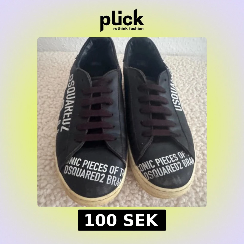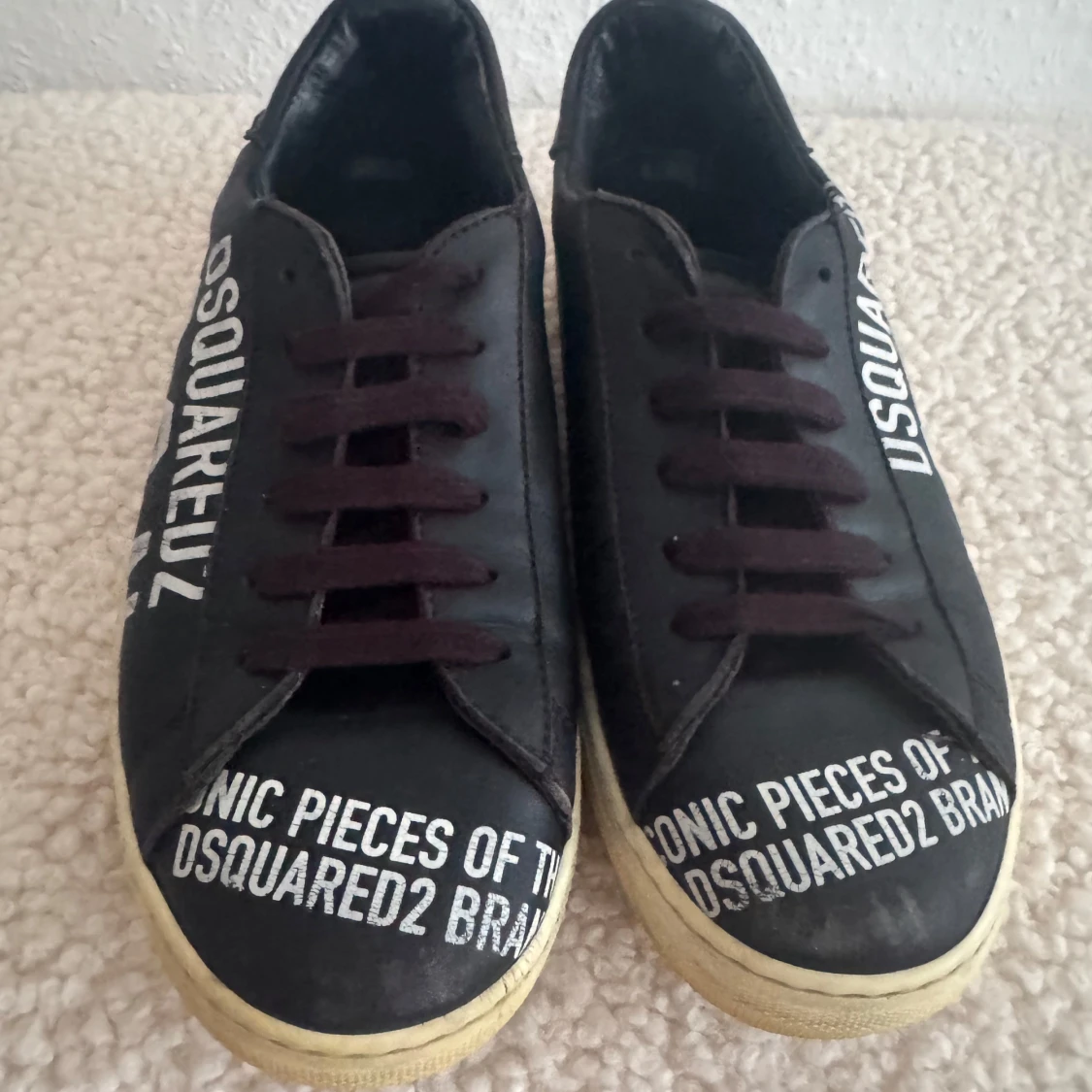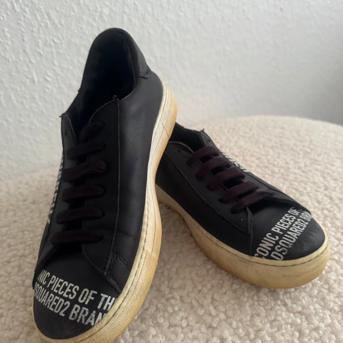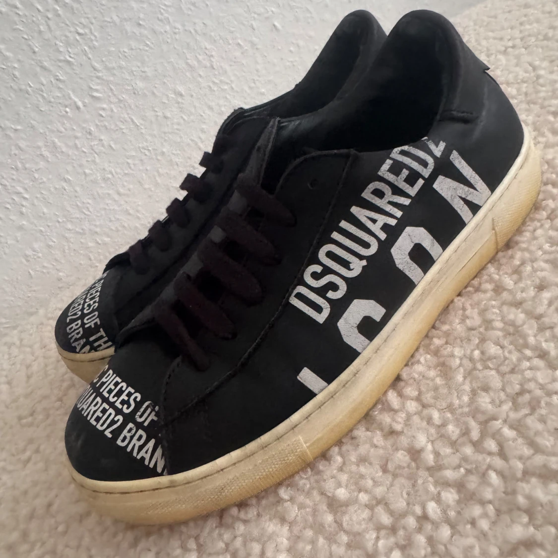 Svarta sneakers från Dsquared2 med vit text på sidan och framtill. Skorna har svarta snören, vit sula och är tillverkade i skinn. Snygg streetstil med tydlig branding och klassisk rund tå. Skavanker framme på skorna och sulan är gulaktig.