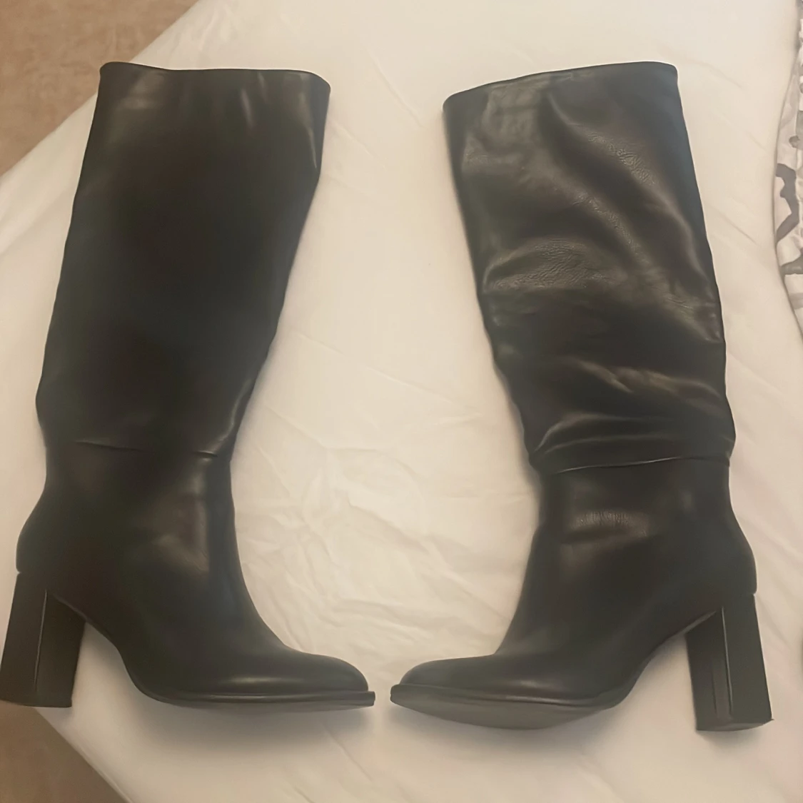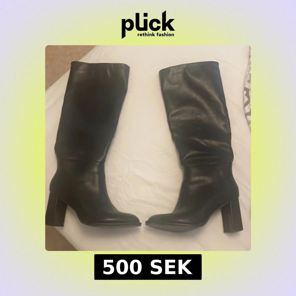Säljer ett par svarta höga stövlar som jag köpte i London från Office. De har en bred klack och rund tå. Skorna är i skinn (inte riktig skinn) och har en stilren design som passar perfekt till höst och vinter, går även att styla till sommaren också. Snygga att styla till både kjol och jeans. Inga defekter. Pris kan diskuteras vid snabb affär💘